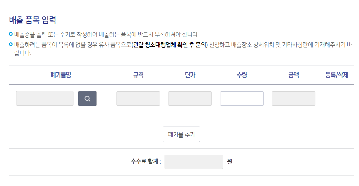 들어가시면 이제 배출 하려는 품목에 대한 선택이 가능합니다