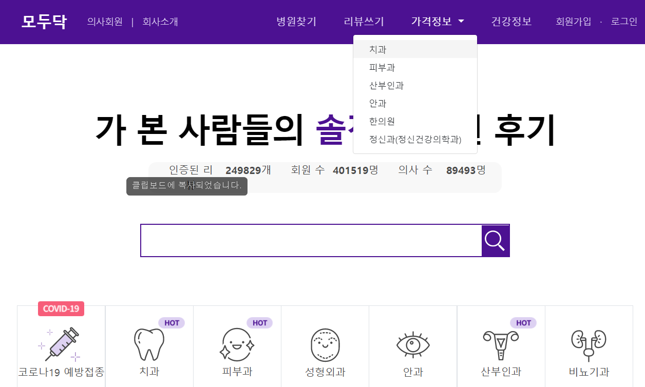 일단 사이트 최 상단에 가격 정보에서 치과를 눌러주겠습니다