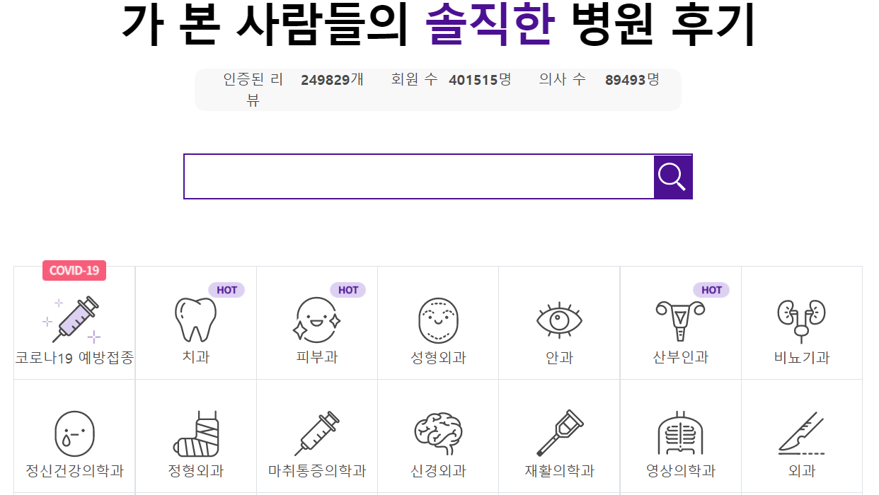 다양한 병원 검색이 가능하며 후기까지 볼 수 있어서 생각보다 괜찮은 사이트 같습니다.