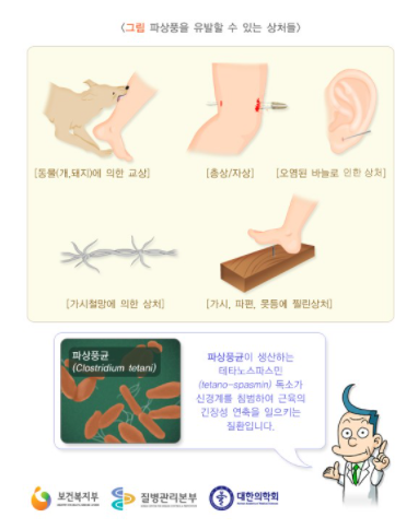 파상풍을 유발할 수 있는 상처들 : 동물(개, 돼지)에 의한 교상, 총상/자상, 오염된 바늘로 인한 상처, 가시철망에 의한 상처, 가시/파편/못 등에 찔린 상처. 파상풍균(Clostridium tetani)이 생산하는 테타노스파민(tetano-spasmin)독소가 신경계를 침범하여 근육의 긴장성 연축을 일으키는 질환임. 연갈색의 파상풍균 삽화