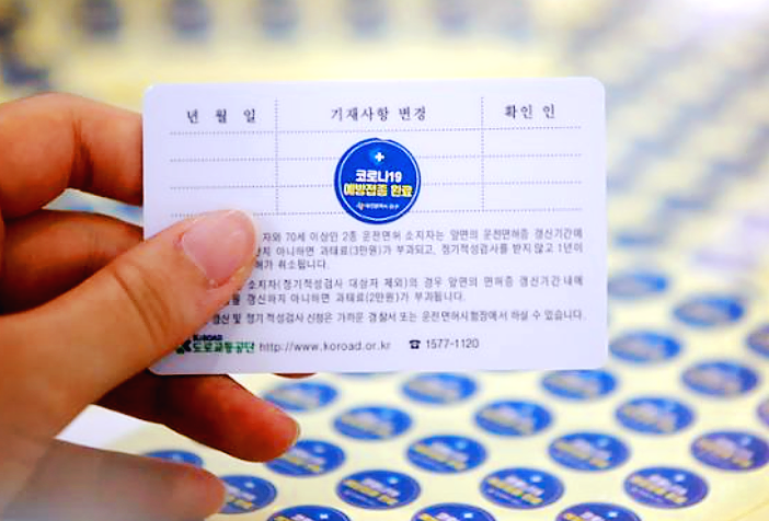 백신을 접종하신 뒤, 주민센터에 가서 스티커 발급을 원하실 경우 간단한 확인 후 스티커를 발급해주는데, 이 스티커는 주민등록증 , 운전면허중, 외국인 등록증, 장애인 등록증 같은 신분증 형태의 카드에 붙여서 다닐 수 있습니다.