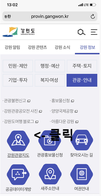 강원관광지도를 누르면 바로 되지만 여기까지 들어가는데 시간이 소요되기 때문에