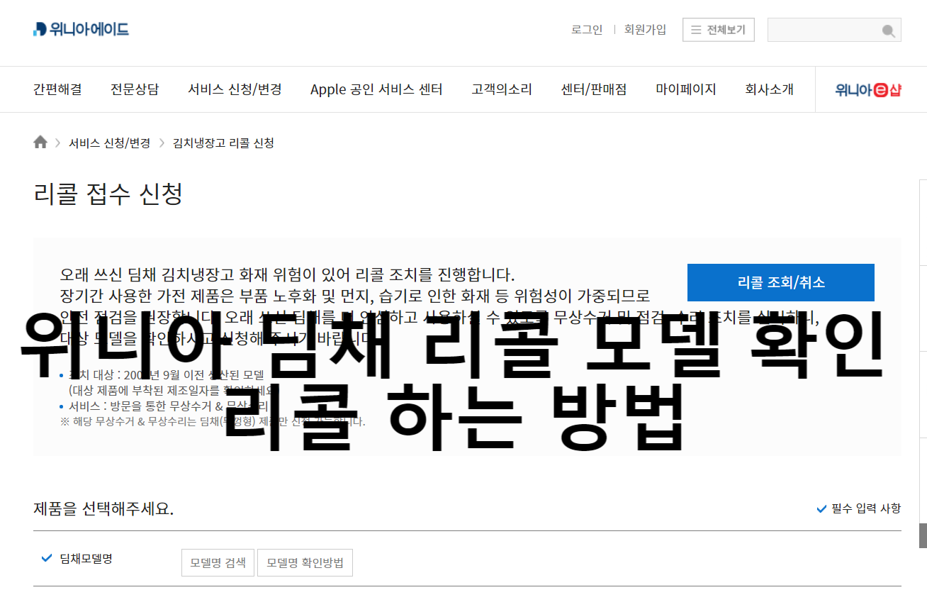 일단 위니아 딤채 사이트에 접속하시면 메인 페이지에 이러한 창이 뜨는데요.