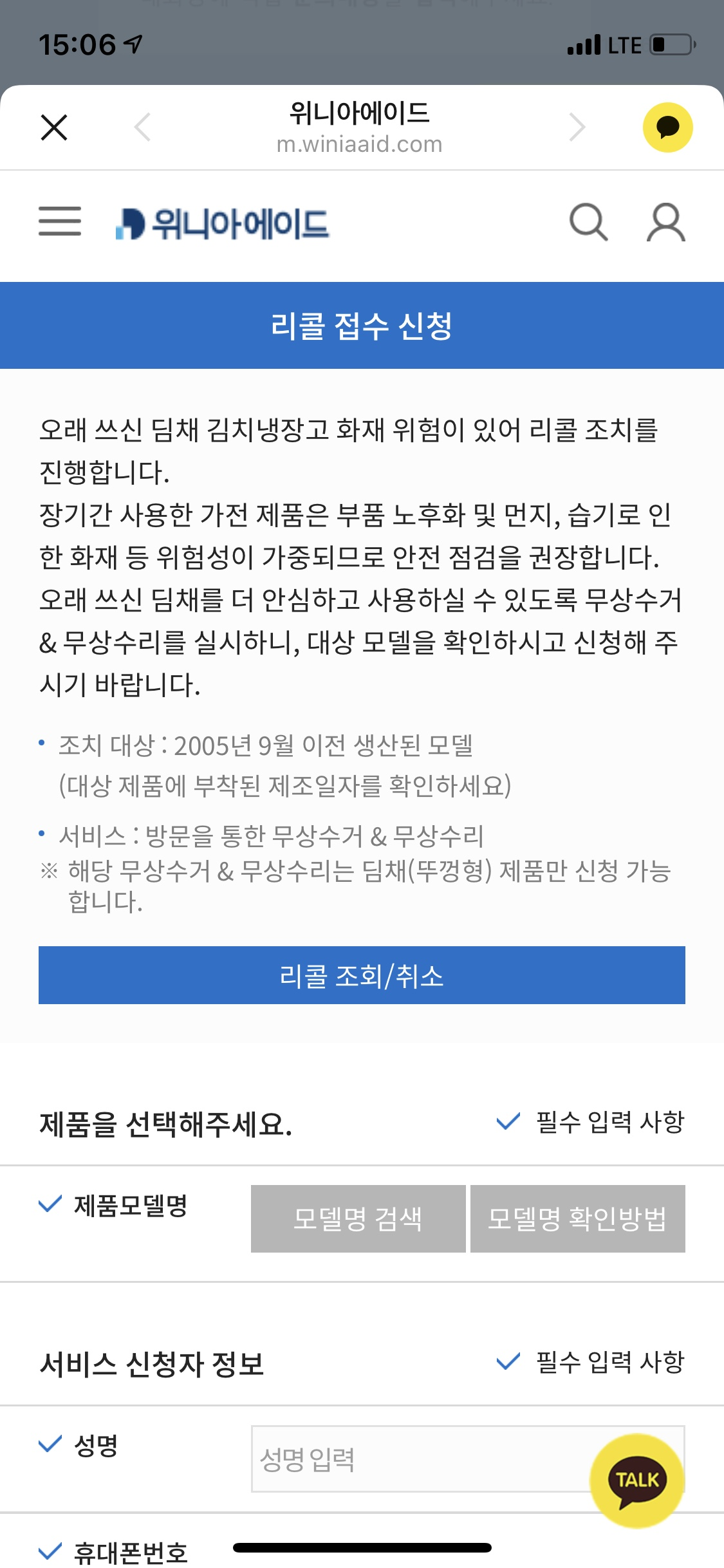 3. 위니아 딤채 카카오 채널을 통한 리콜 신청