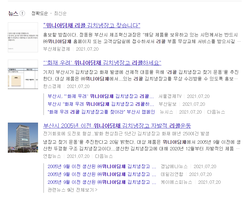이처럼 뉴스에서도 위니아딤채 김치 냉장고들 리콜 관련된 기사가 많은데요