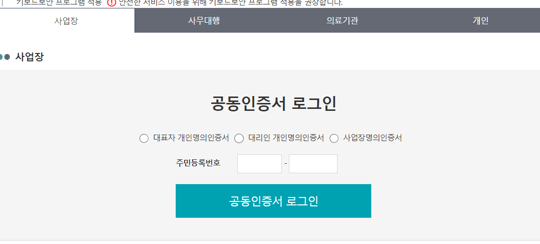 이후에 공인인증서로 로그인 하신 뒤에 정보를 입력하면 고용보험 가입이 가능합니다.