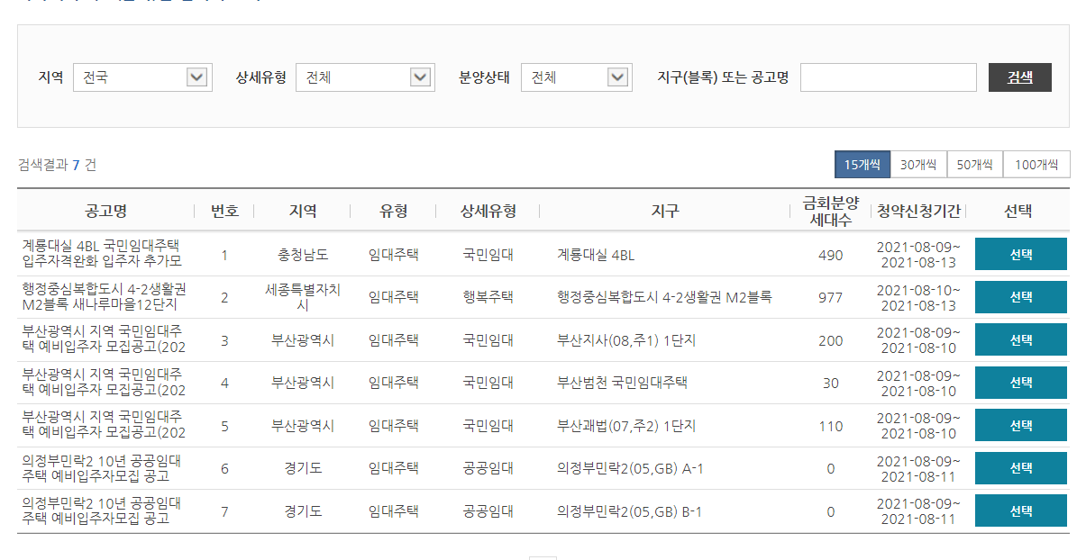 현재 전국에서 임대주택 신청 가능한 지역이 총 7개만 보여집니다.