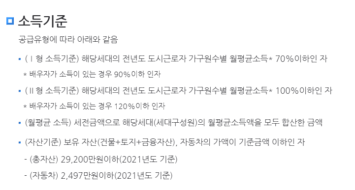 1. 월평균 소득 금액이 전년도 도시근로자 월 평균 소득 (1가구) 70%이하일 것