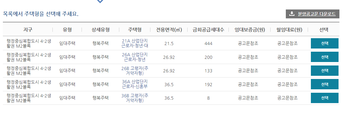 세종 특별자치도시로 클릭을 해보니 아래와 같이 전용 면적과 공급되는 세대수를 확인할 수 있었습니다.