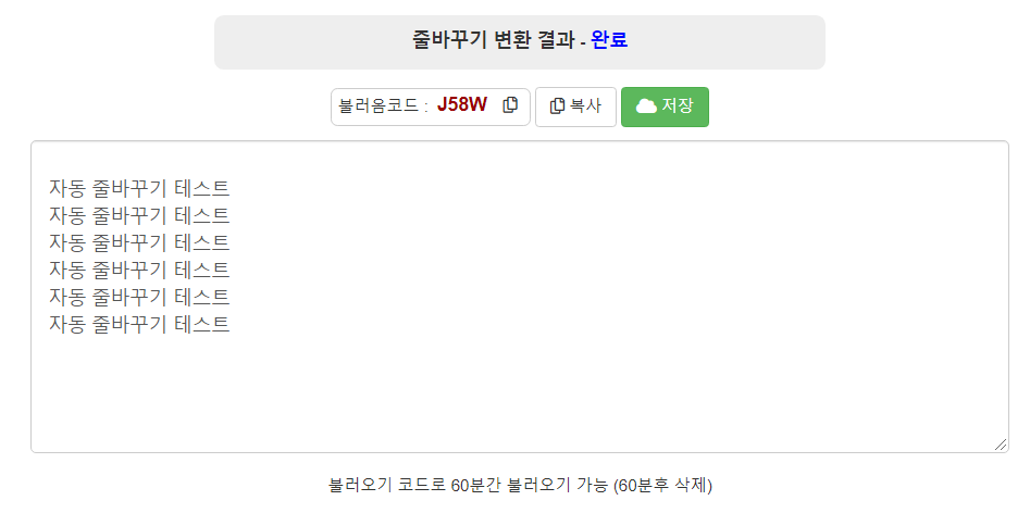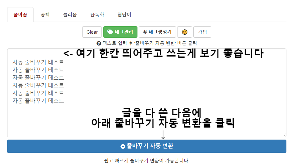 원하는 문단 형태로 글을 써준 뒤에 아래 줄바꾸기 자동 변환을 눌러주시면 아래쪽에 이렇게 글이 변환되서 나타납니다.