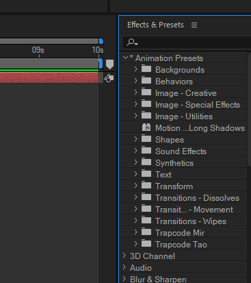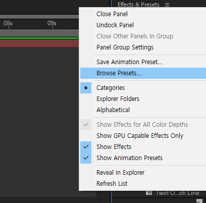 이러한 효과들을 간단하게 보기 위해선 이펙트 & 프리셋 바로 옆에 3줄을 오른쪽 마우스 클릭