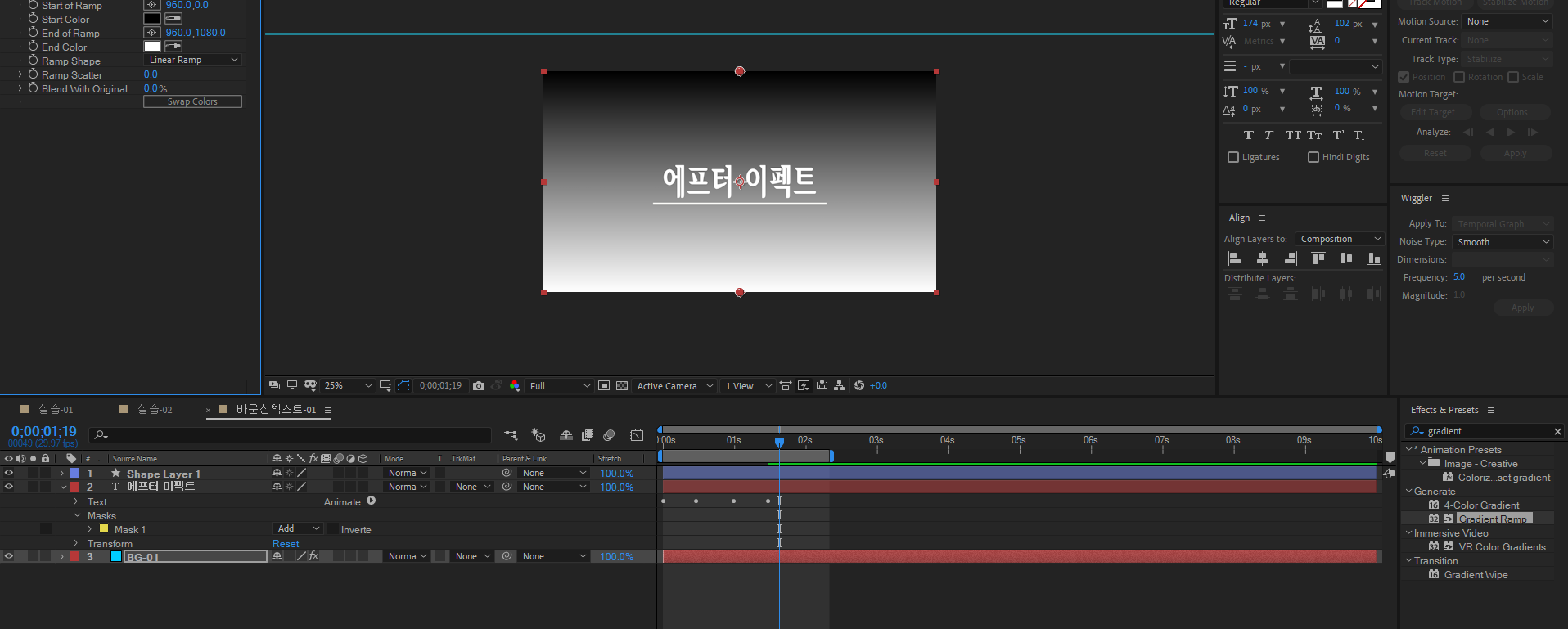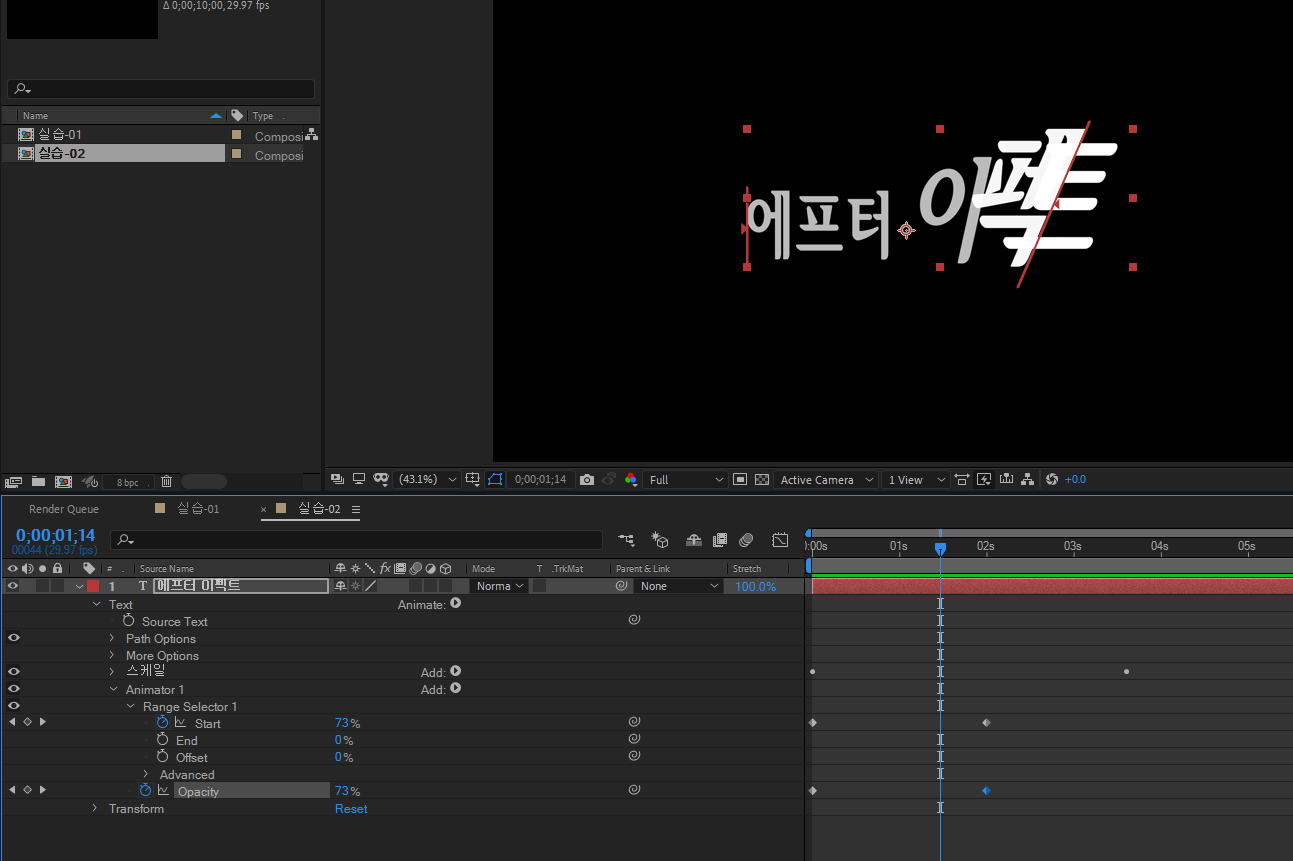 | 에프터 이펙트 기초 강의 수업 4회차 (트렌지션 전환, 글자 나타나기) (0) | 2021.08.27 |