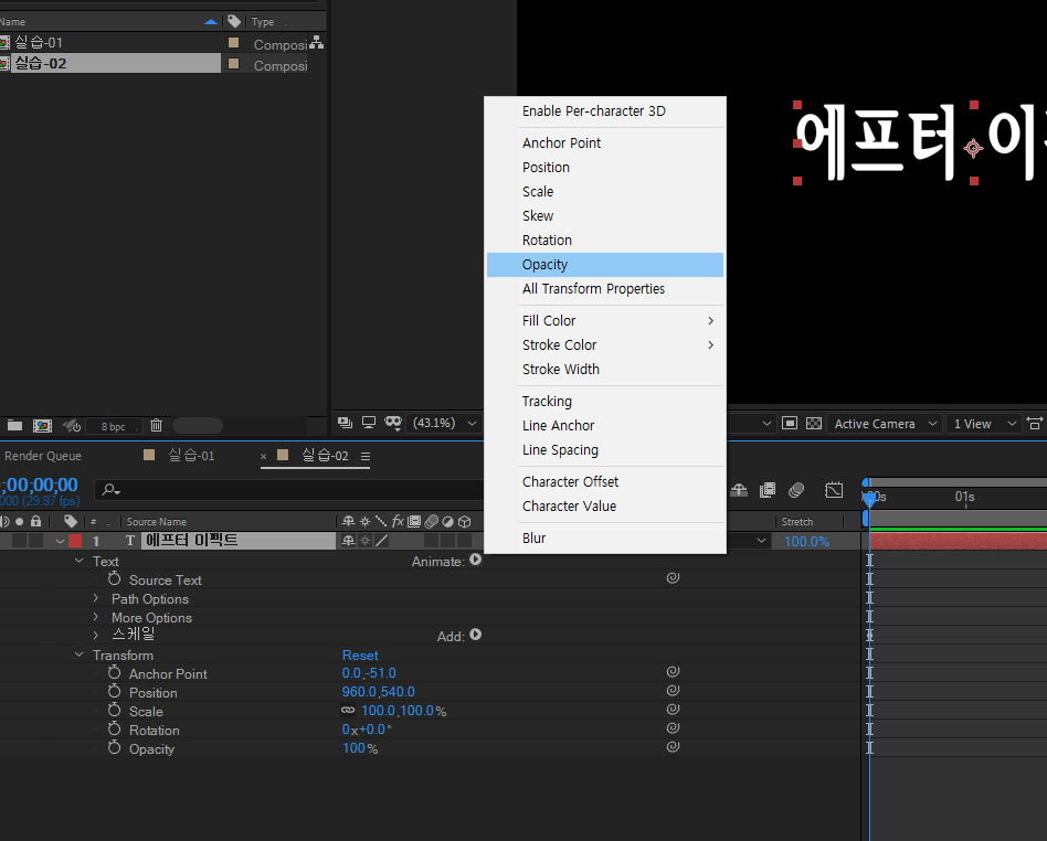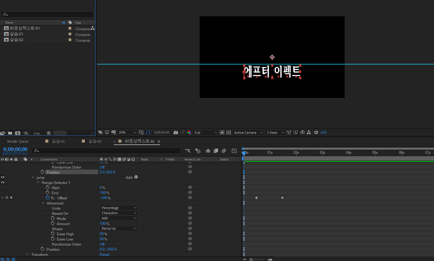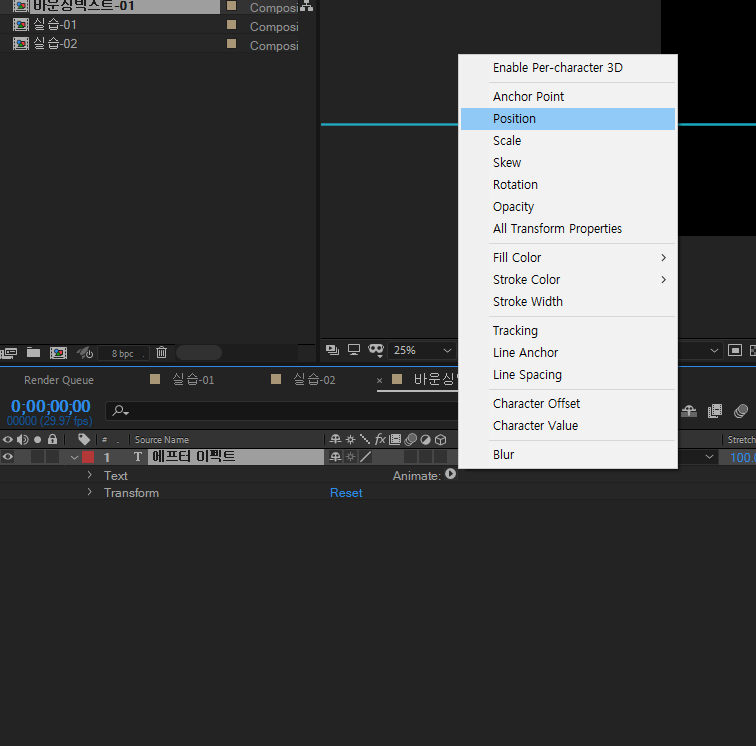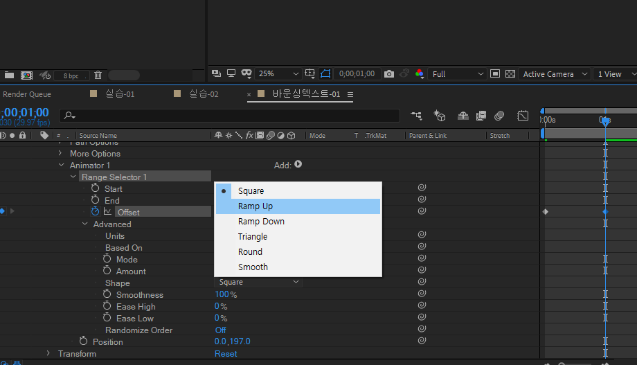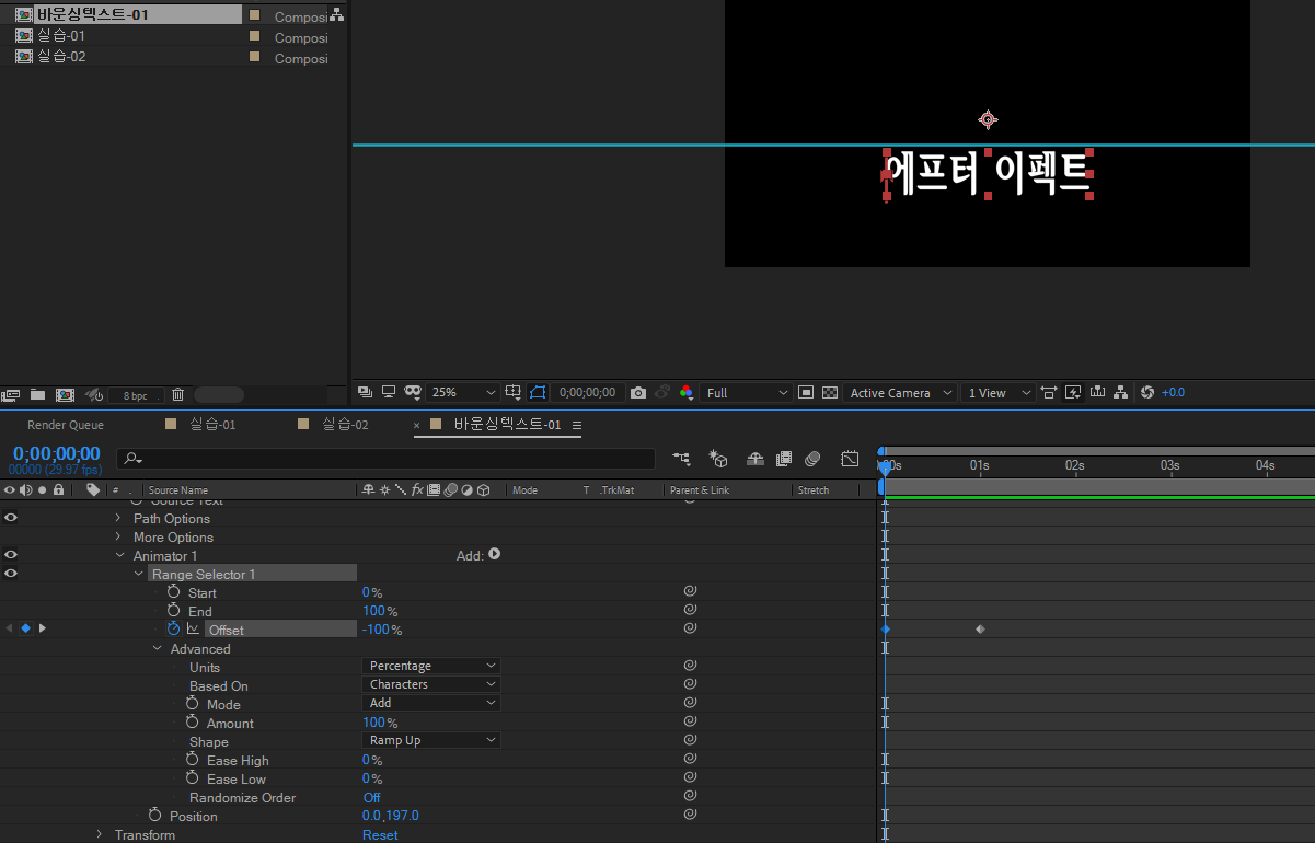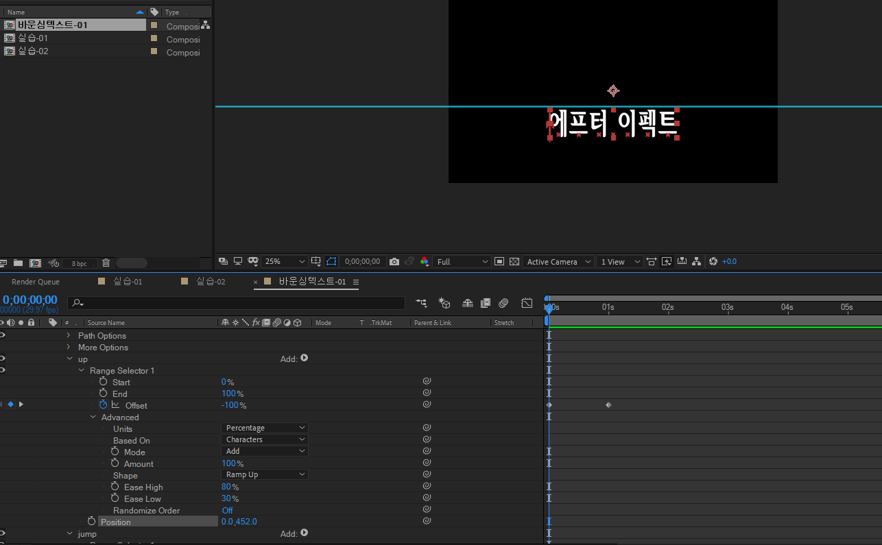 램프 업을 하면 글자가 올라가있으니 포지션 에니메이터를 - 100으로바꿔줌