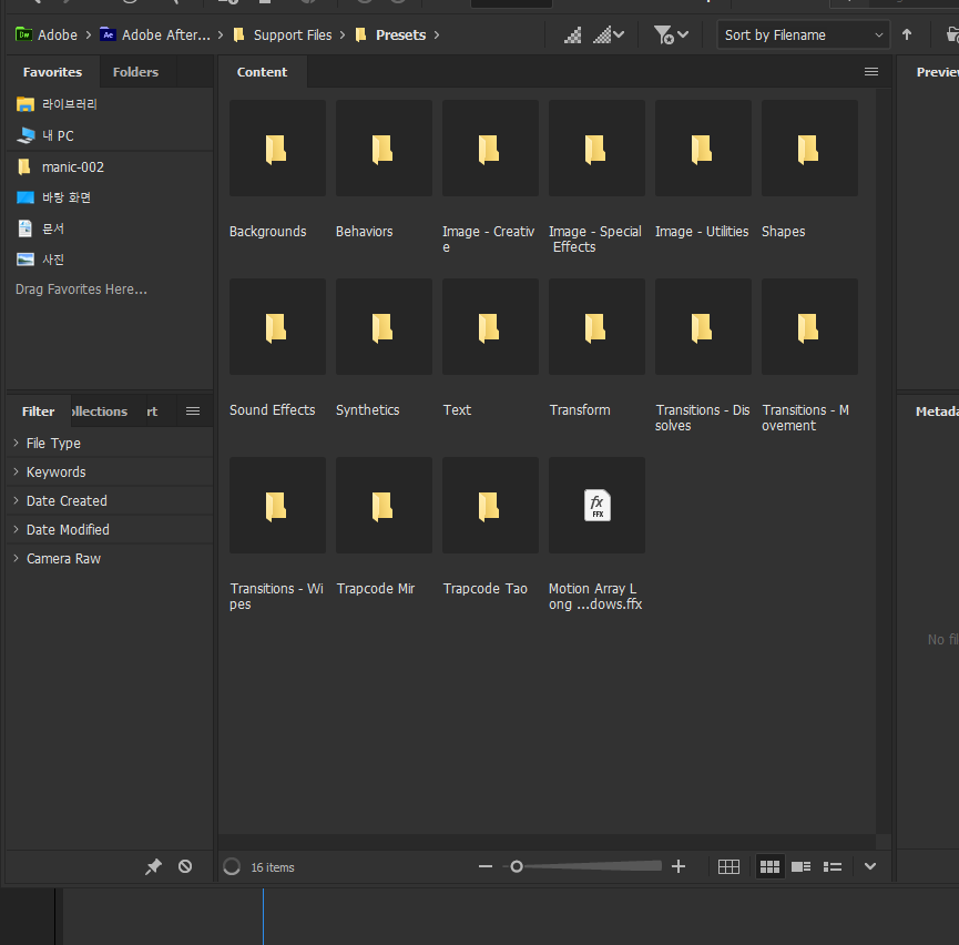 이러한 효과들을 간단하게 보기 위해선 이펙트 & 프리셋 바로 옆에 3줄을 오른쪽 마우스 클릭