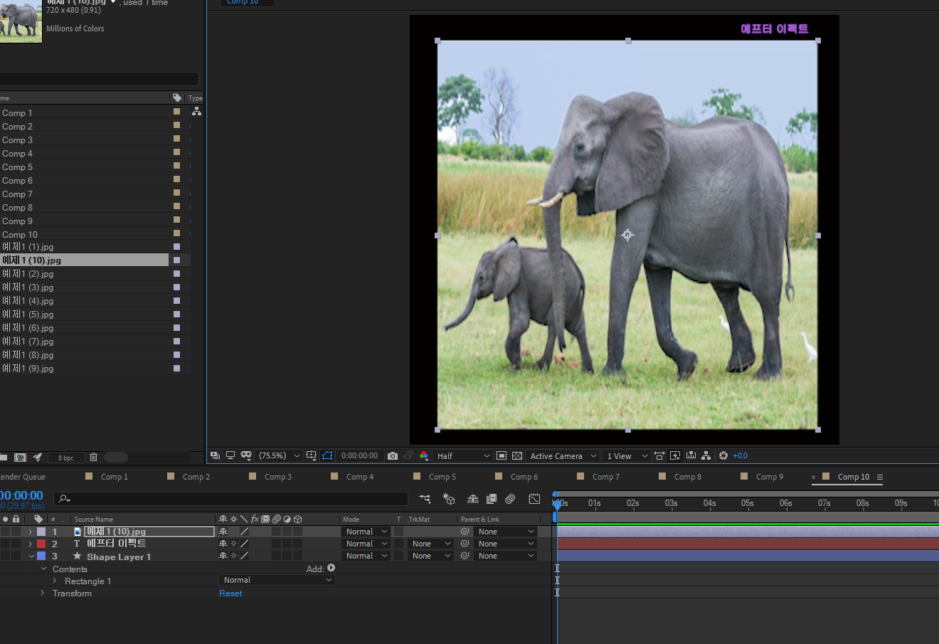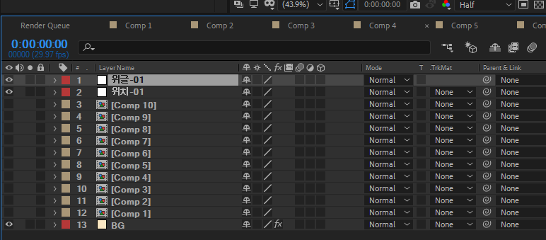 메인 컨포지션 (1920x1080) 하나 만들어서 다 넣어줍니다