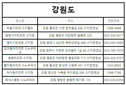 전국 스키장 위치 및 주소 확인