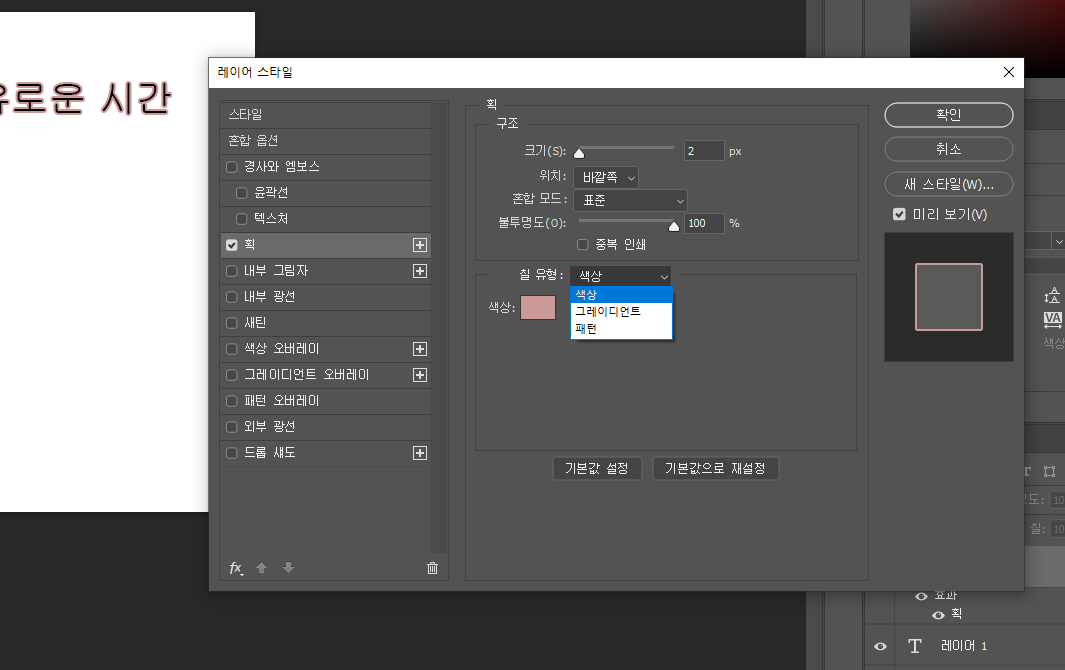 편집 -> 획 -> 색상 변경 가능한데 위와 같이 느낌표 뜨면 프린트 출력시 안나온다는 표시