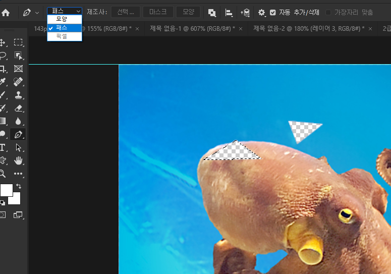누끼따기 중에서 삭제하고 싶은 영역 펜툴로 그려준 다음에