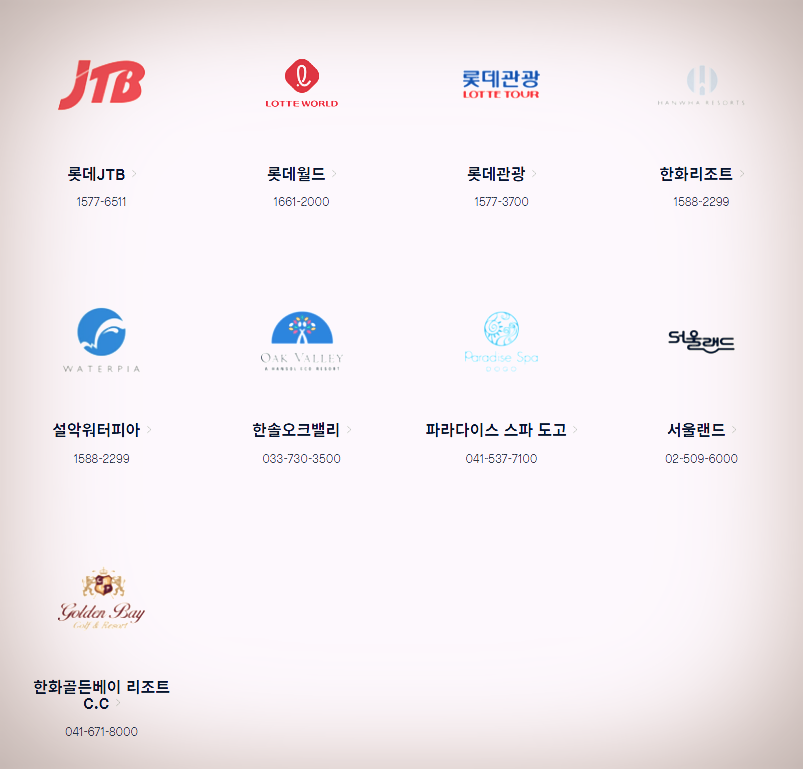 롯데관광, 한화리조트, 설악워터피아, 한솔오크밸리, 파라다이스스파도고,  서울 랜드,