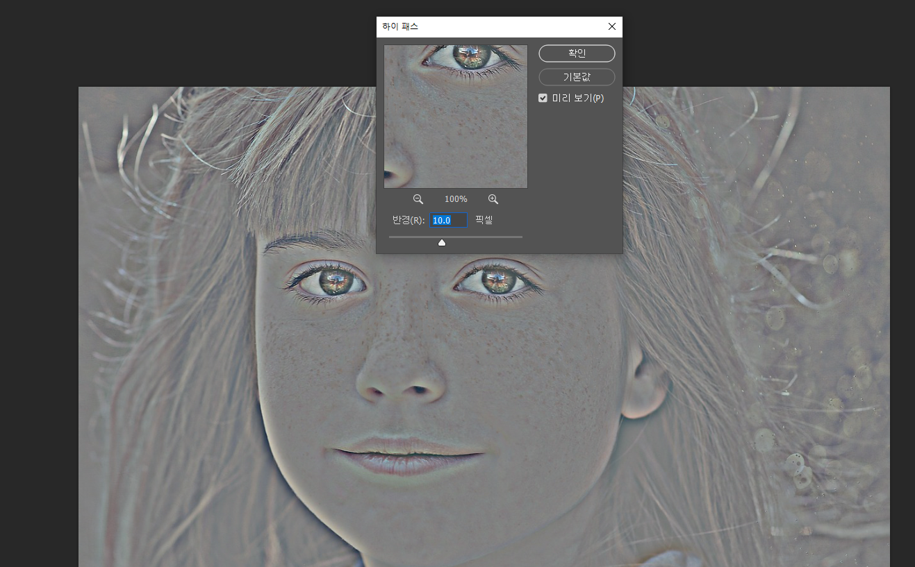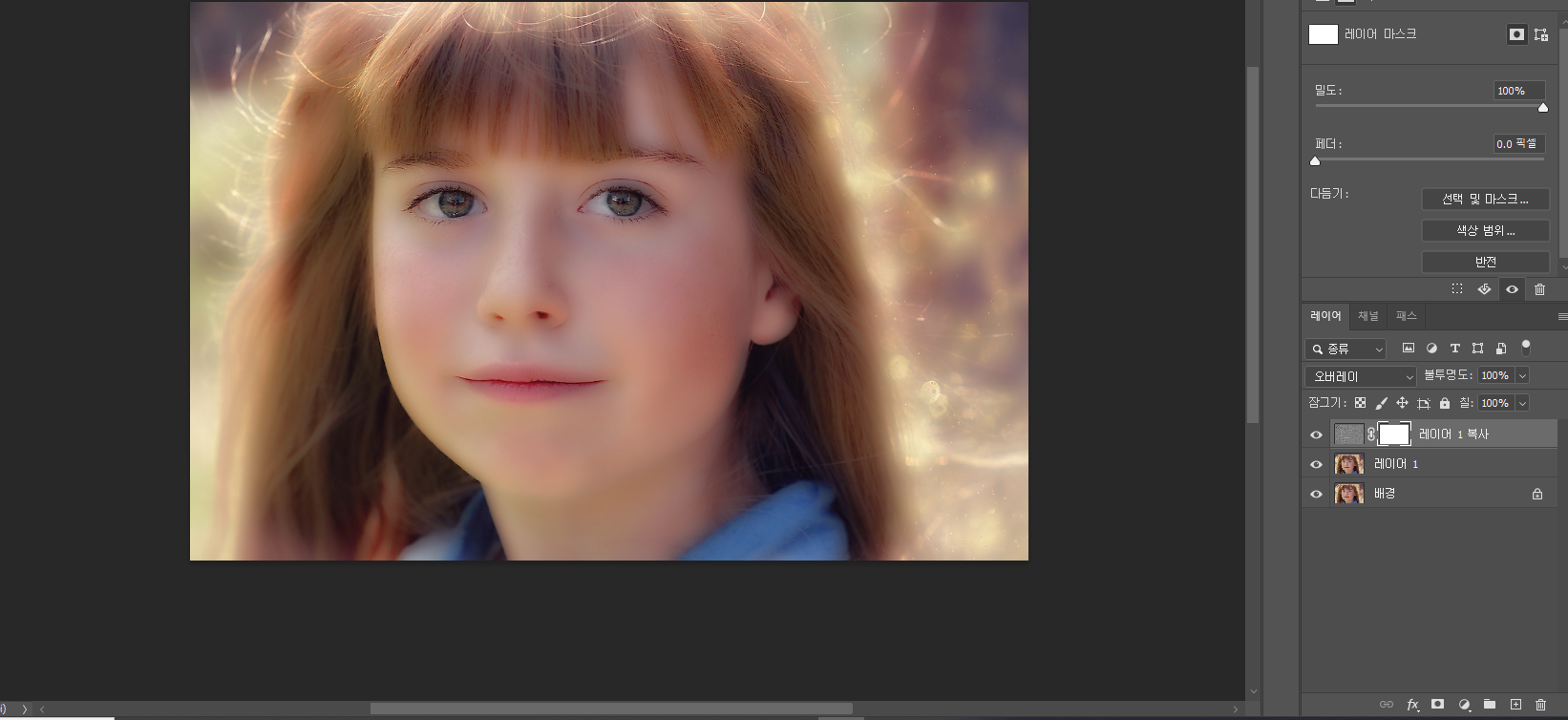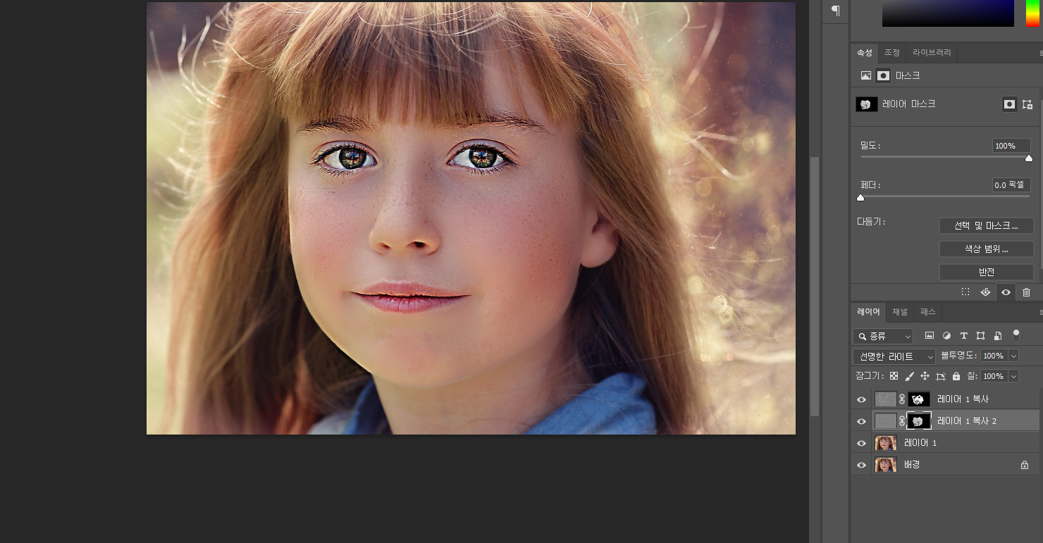 알트 누르고 레이어 마스크 눌러주면 검정색 마스크 나옴 (뽀샵 효과 사라짐)