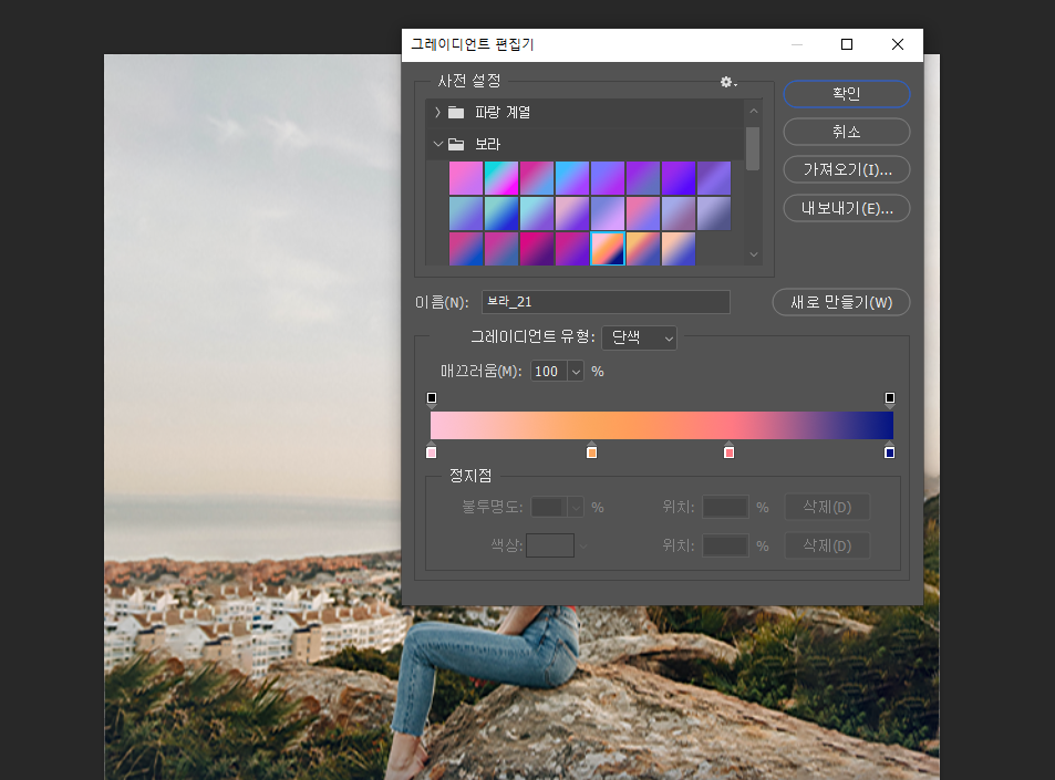 레이어 추가 -> 그라디언트 격자무니 (가운데) -> 하나는 검은색으로
