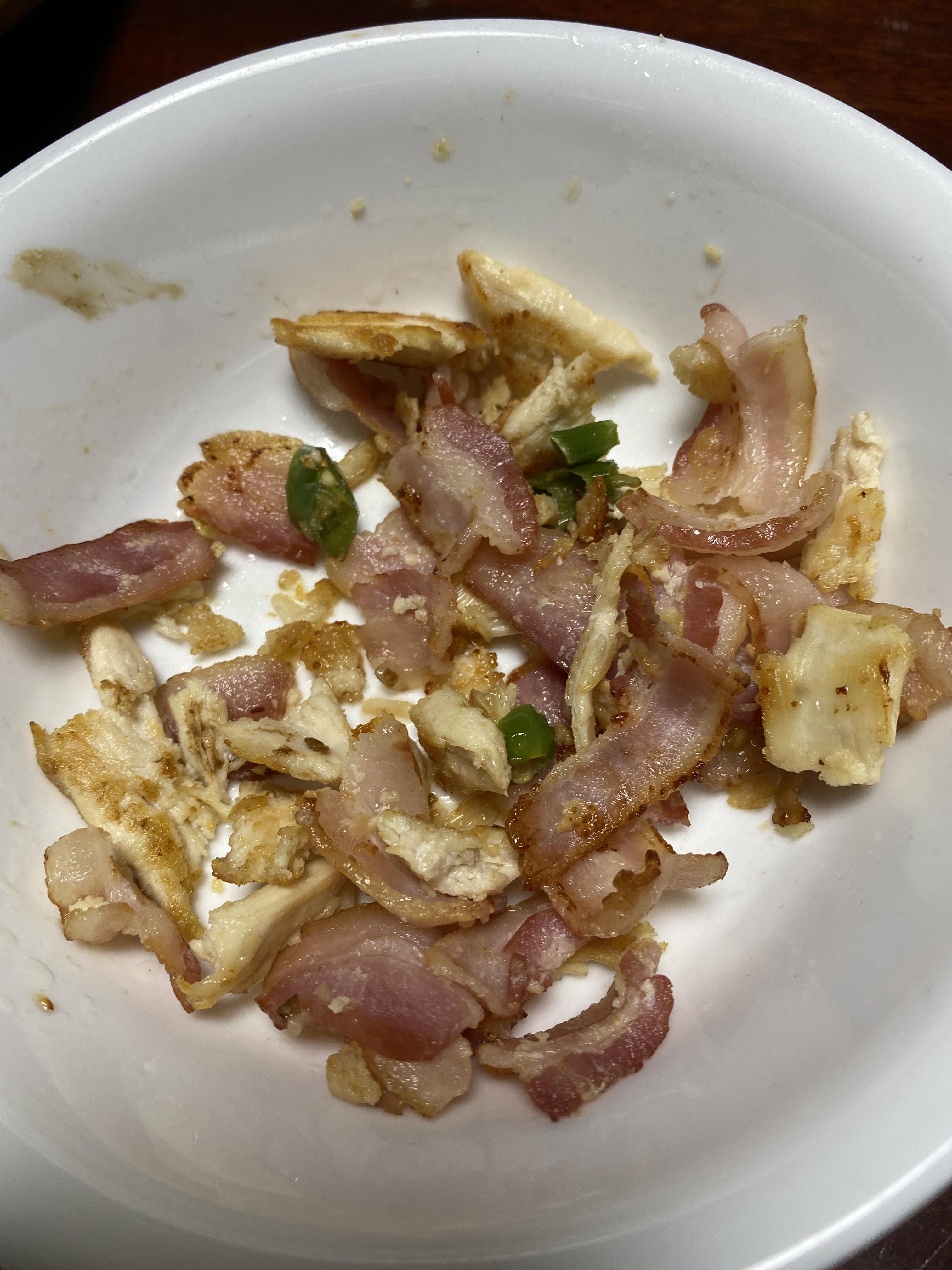 전 베이컨이랑 닭가슴살과 고추, 다진 마늘을 기름에 볶은 짭쪼름한 요리로 맛과 배를 채웠습니다