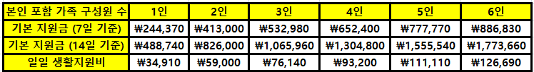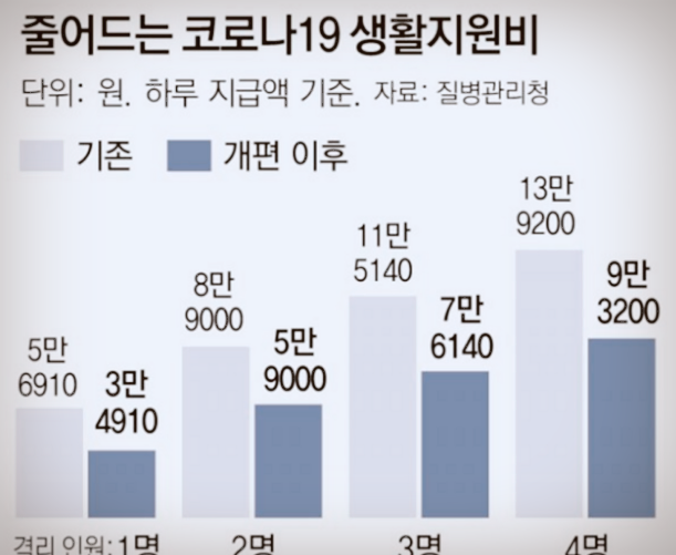 기존에는 가구원을 기준으로 지원금이 나왔다면, 개정된 현재는 실제로 격리중인 인원 수에 맞춰서 지원금이 나온다고 합니다.