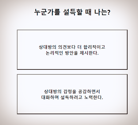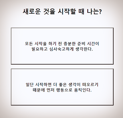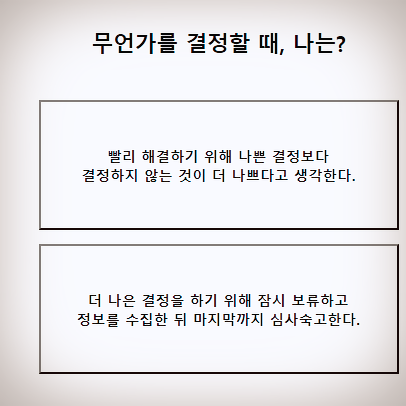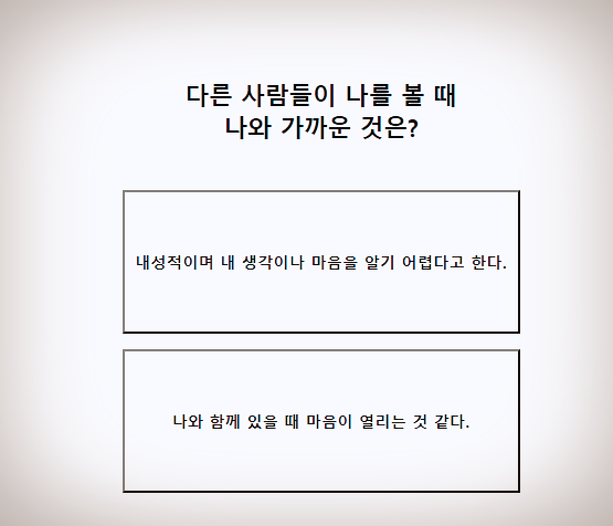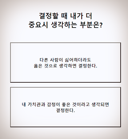 총 20개 문항이며 두개 중 하나를 고르는 문항이라서 굉장히 간단하지만 심도 있는 문항들이 있습니다