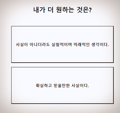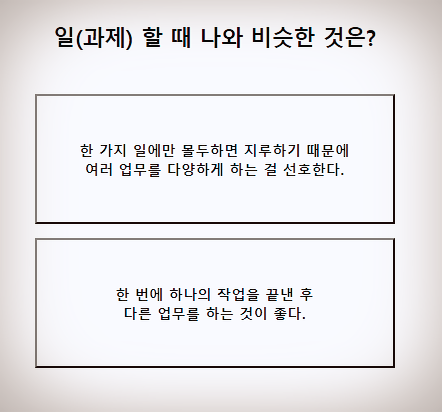 총 20개 문항이며 두개 중 하나를 고르는 문항이라서 굉장히 간단하지만 심도 있는 문항들이 있습니다