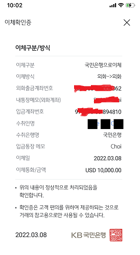 같은 KB은행간의 송금이기 때문에 달러를 송금하는데도 수수료가 하나도 발생하지 않습니다.