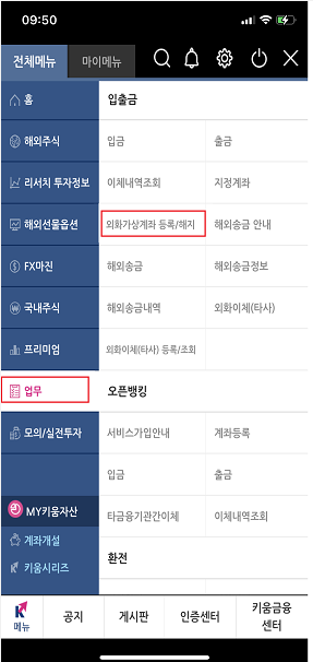왼쪽 하단에 업무 -> 입출금 목록중에 외화가상계좌 등록/해지 를 선택합니다.