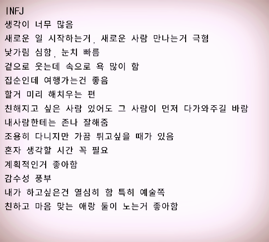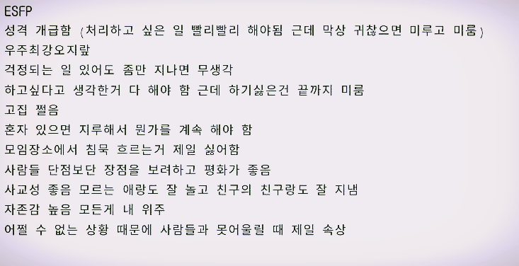 혹시 MBTI검사를 안해보셨다면 아래 Sakinorva 버전의 MBTI 를 한번 해보시길 추천드립니다.