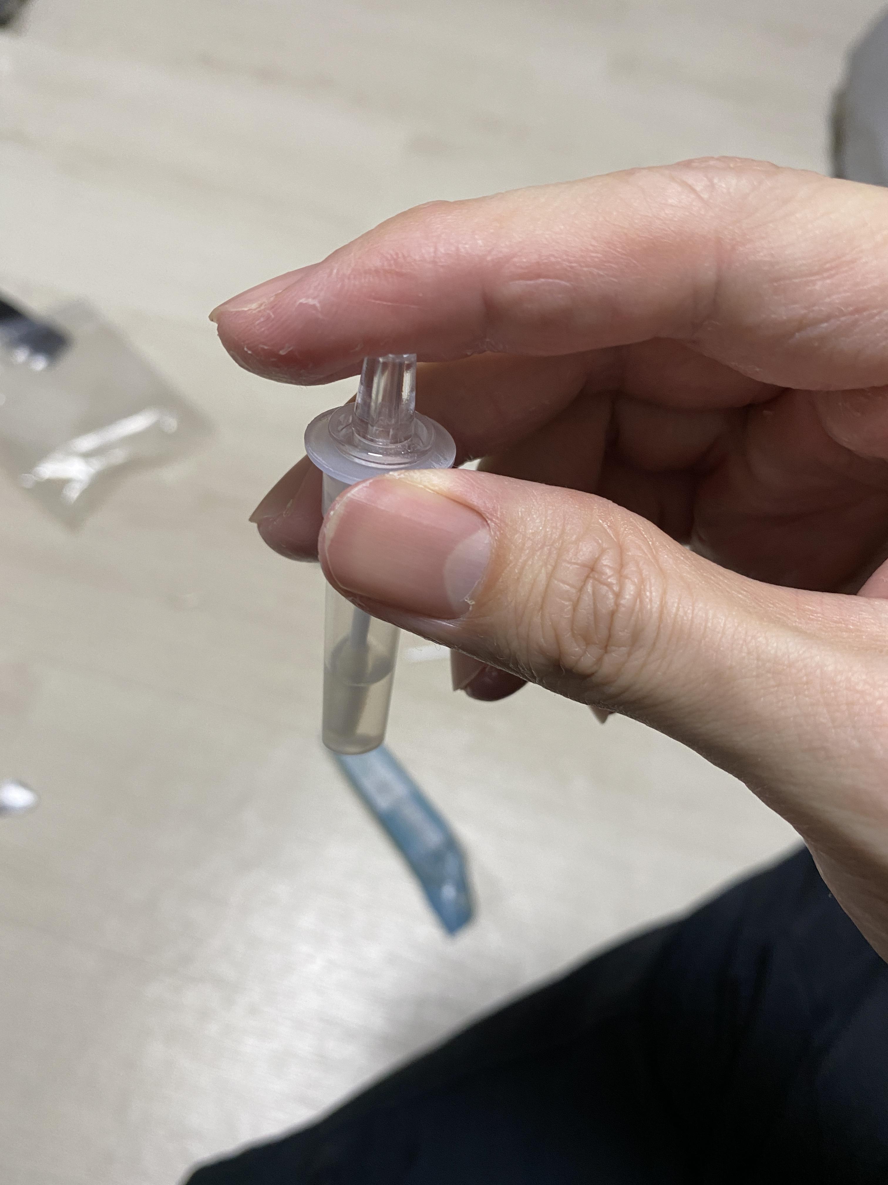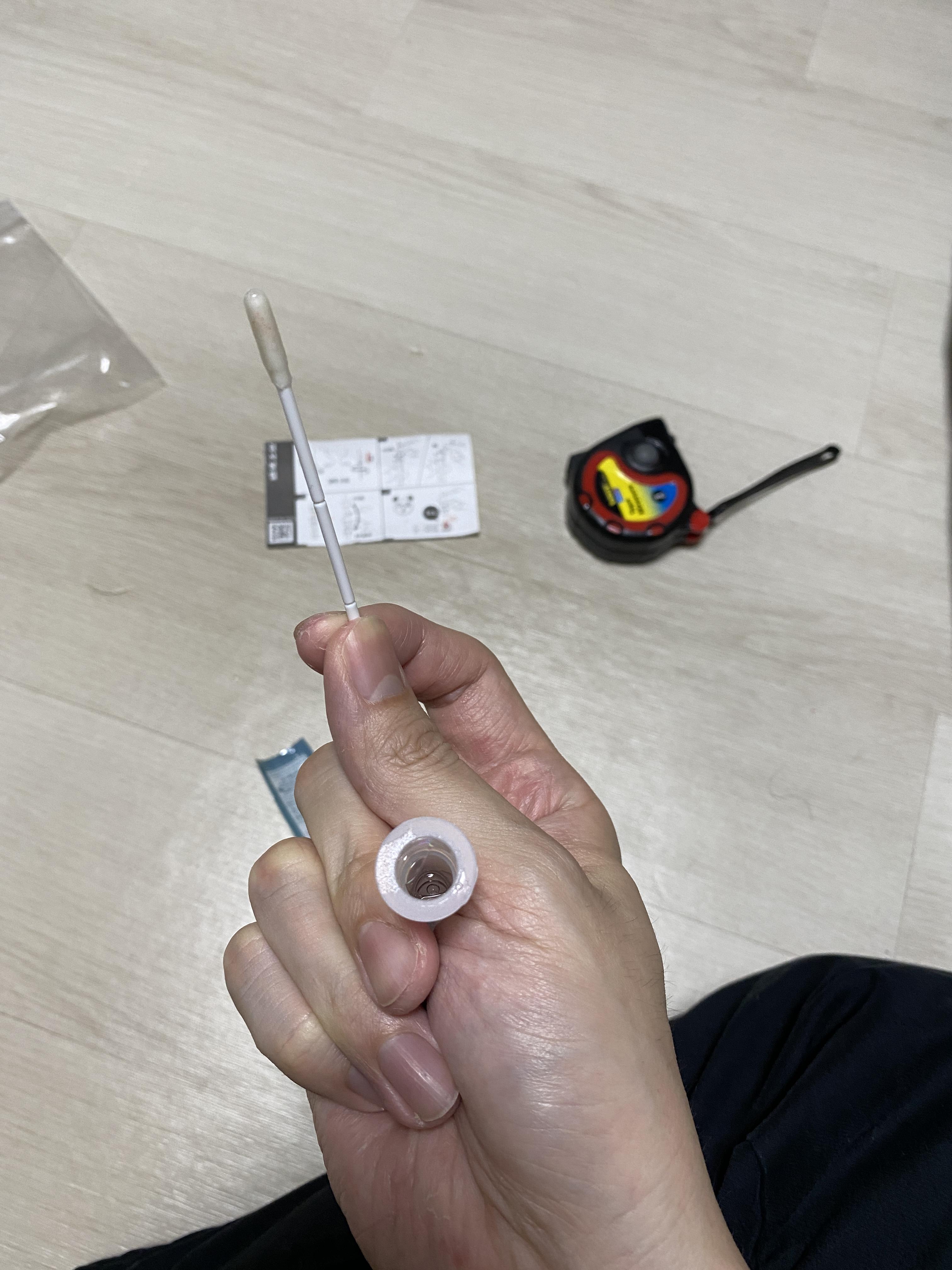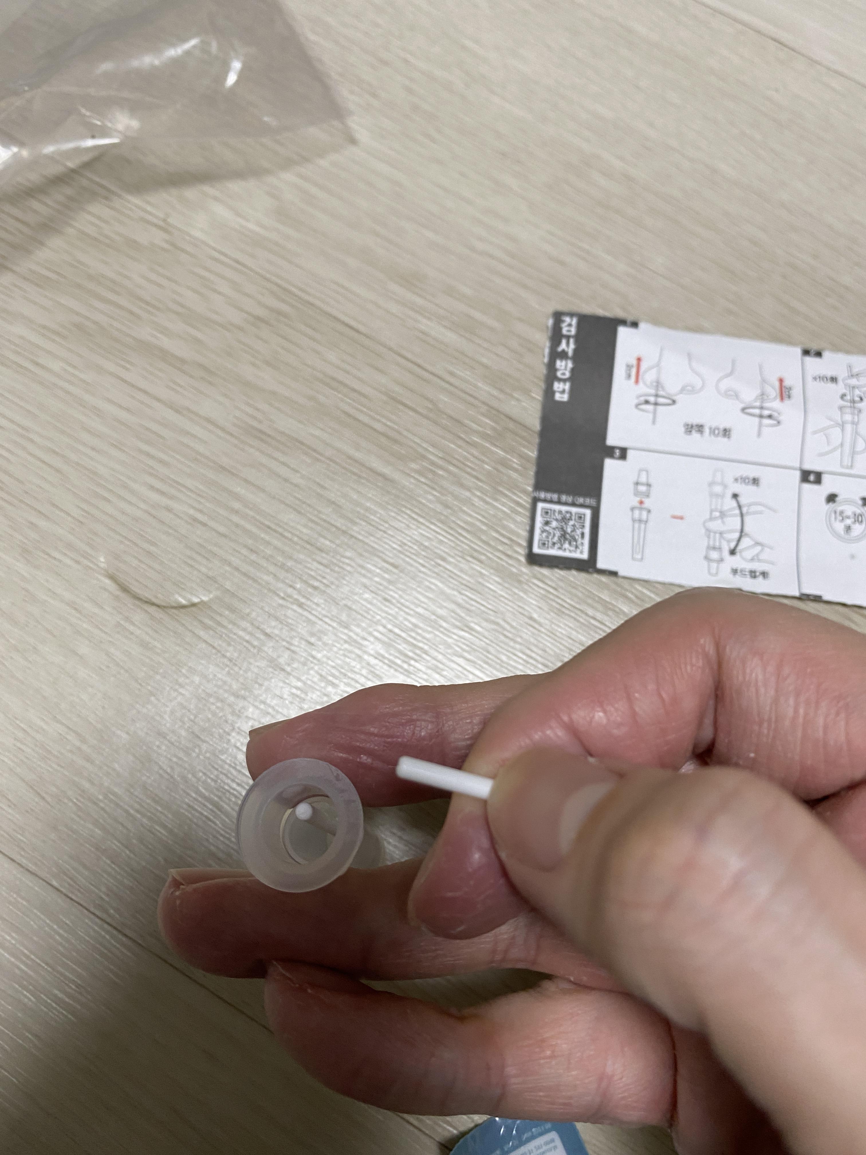 통에 액체가 들어가있는데 그 액체가 면봉에 묻은 제 코 속 성분이랑 합쳐져서 코로나 검사가 되는 듯 합니다.