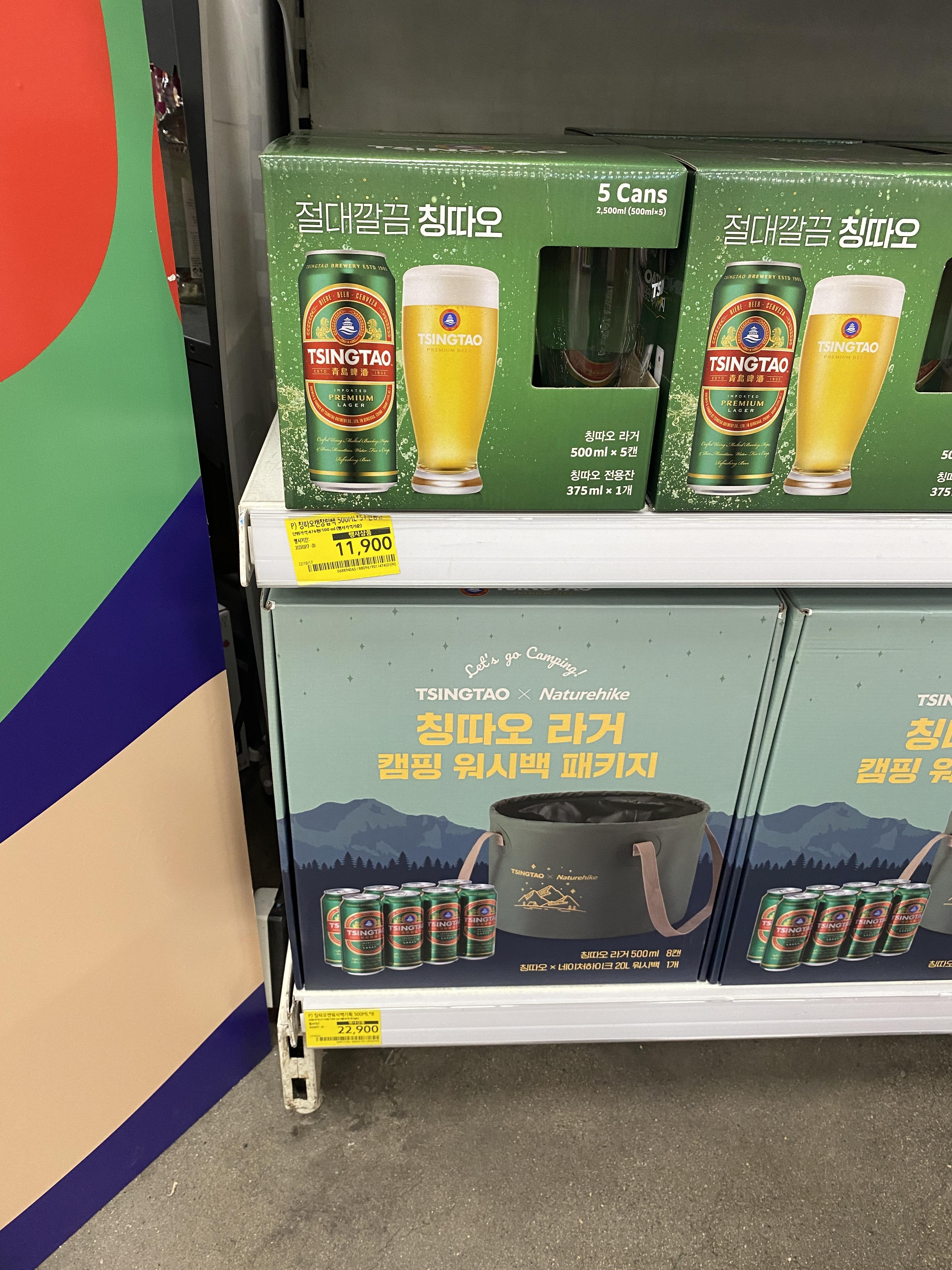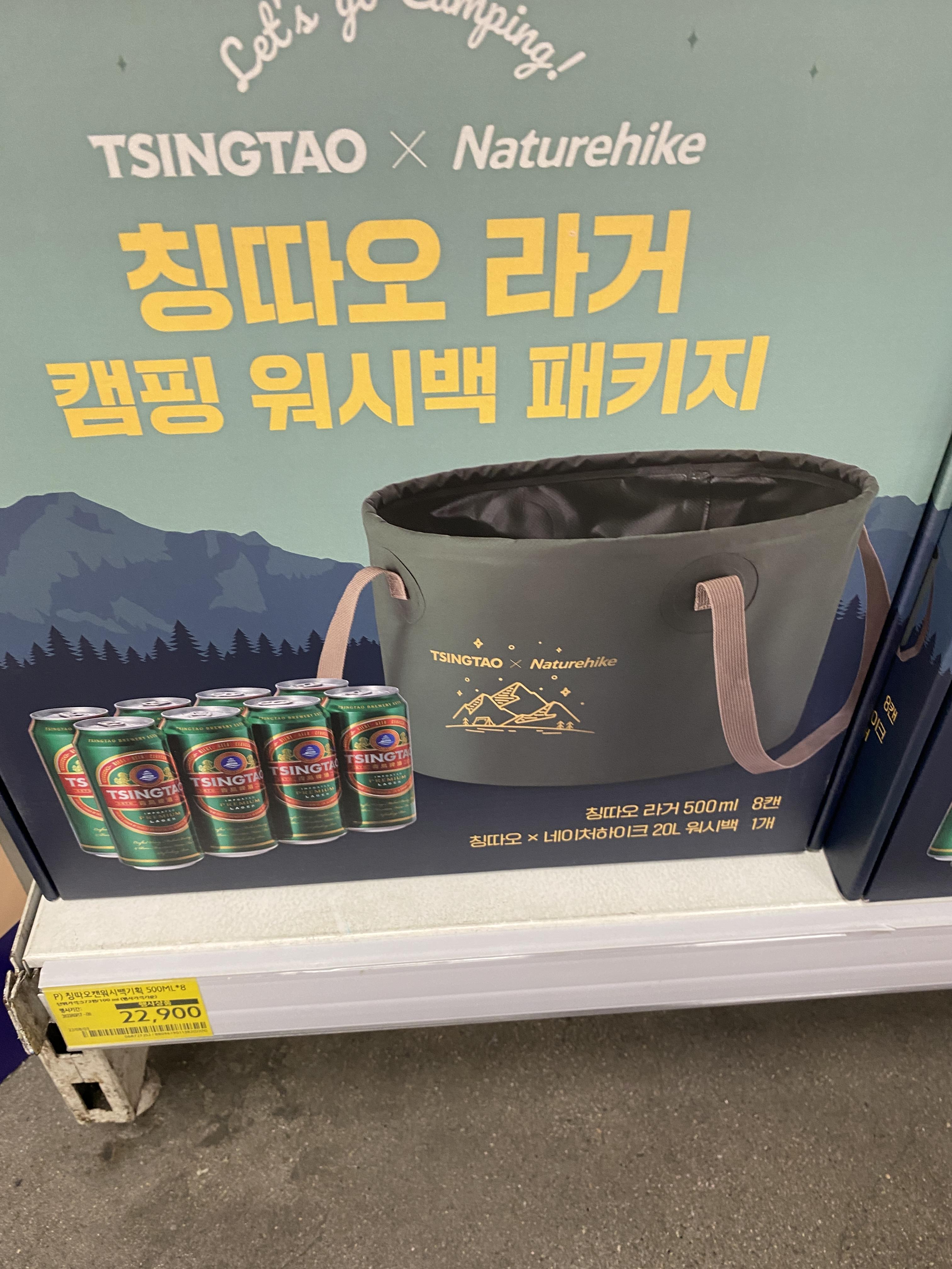 큼지막산 캠핑 워시백 패키지인데 칭따오 맥주 자체만 해도 맛이 좋은 편이기에 평소에도 인기가 많은데 캠핑 워시백이라니…!