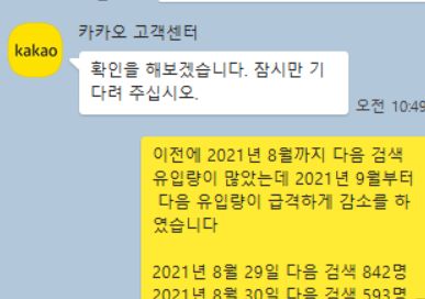 다음에서 저품질이 걸려서 검색이 안된다고 말했으며, 정확한 다음 검색 수와 저품질에 걸린 것 같다고 문의를 넣었습니다.
