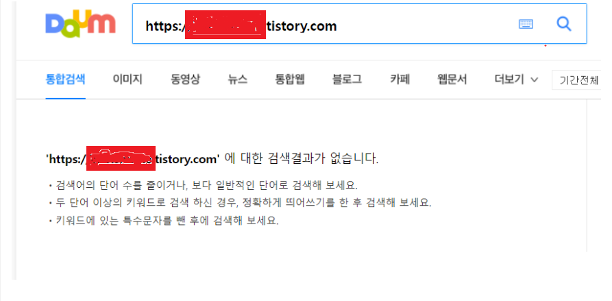 2. 다음 검색창에 내 티스토리 주소를 검색하면 검색이 되는지, 안된다면 저품질에 걸린게 확실하다고 합니다.