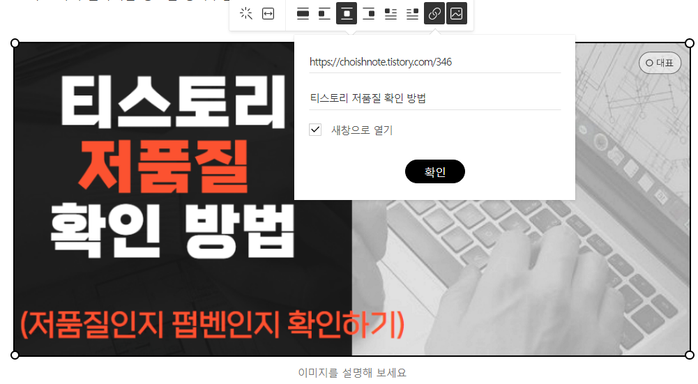 아래와 같이 사진을 하나 올린뒤 링크 삽입/수정 & 대체텍스트 삽입을 눌러줍니다