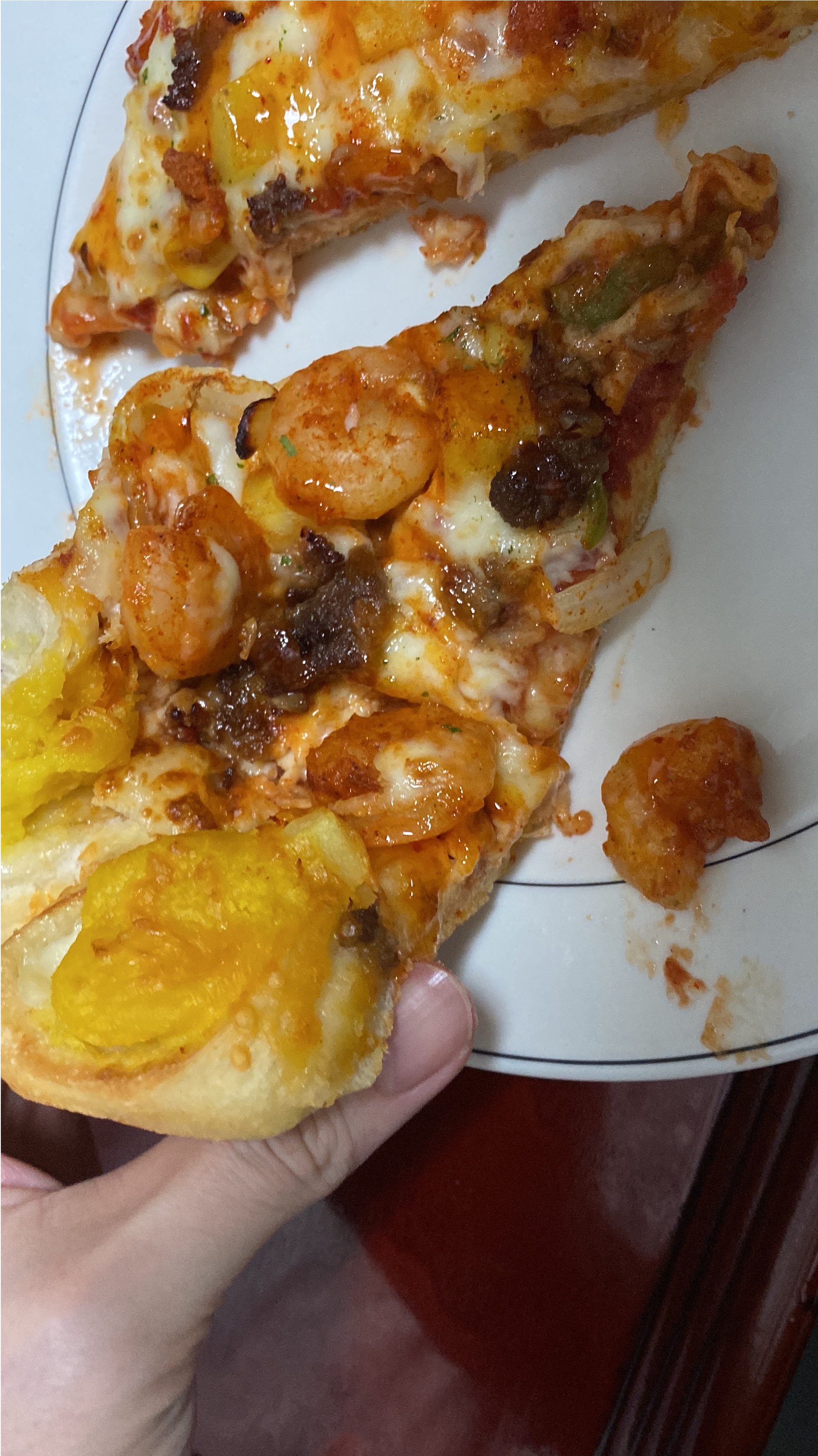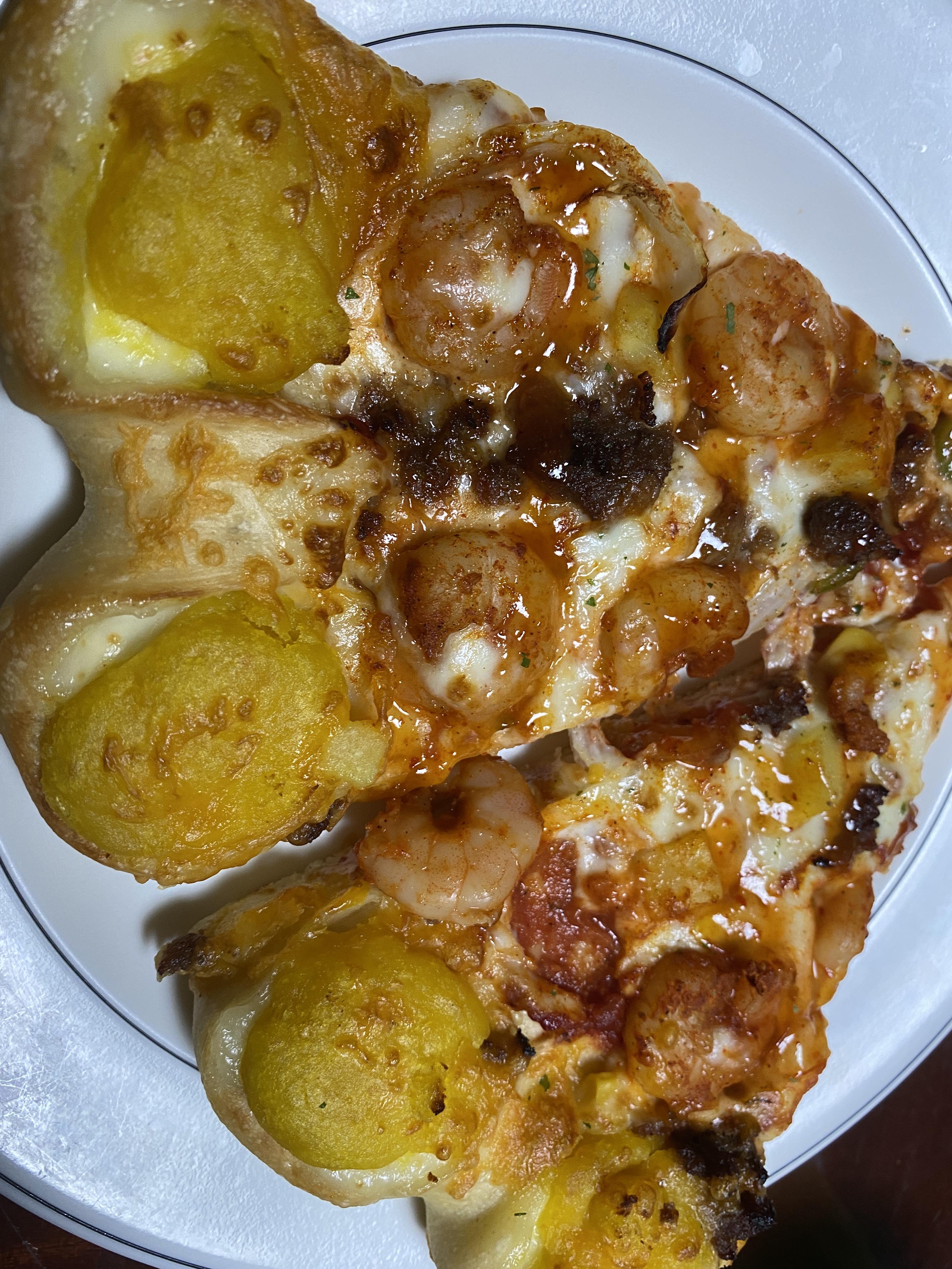 케이준 더블 쉬림프 피자에 추가로 뒤에 콘 치즈 포켓을 고를 수 있습니다
