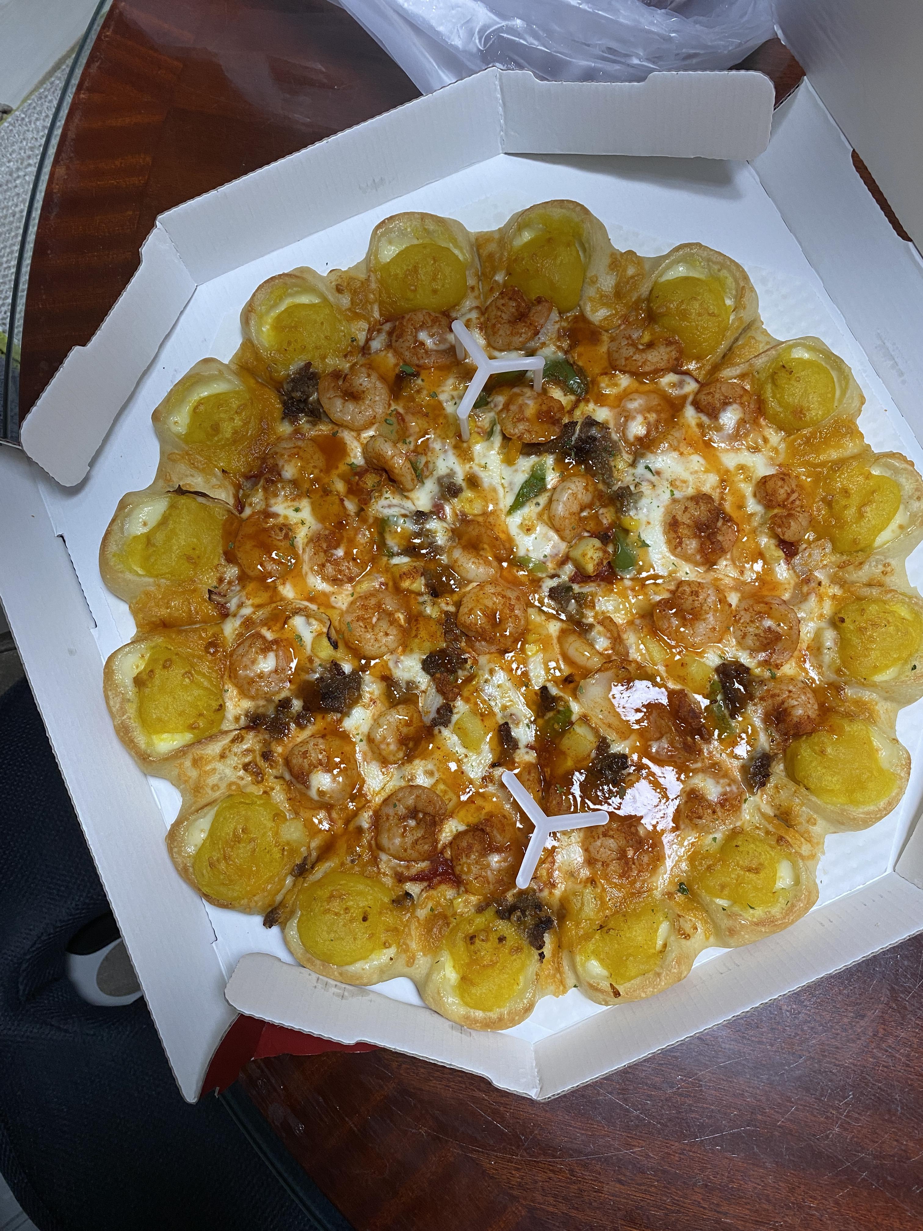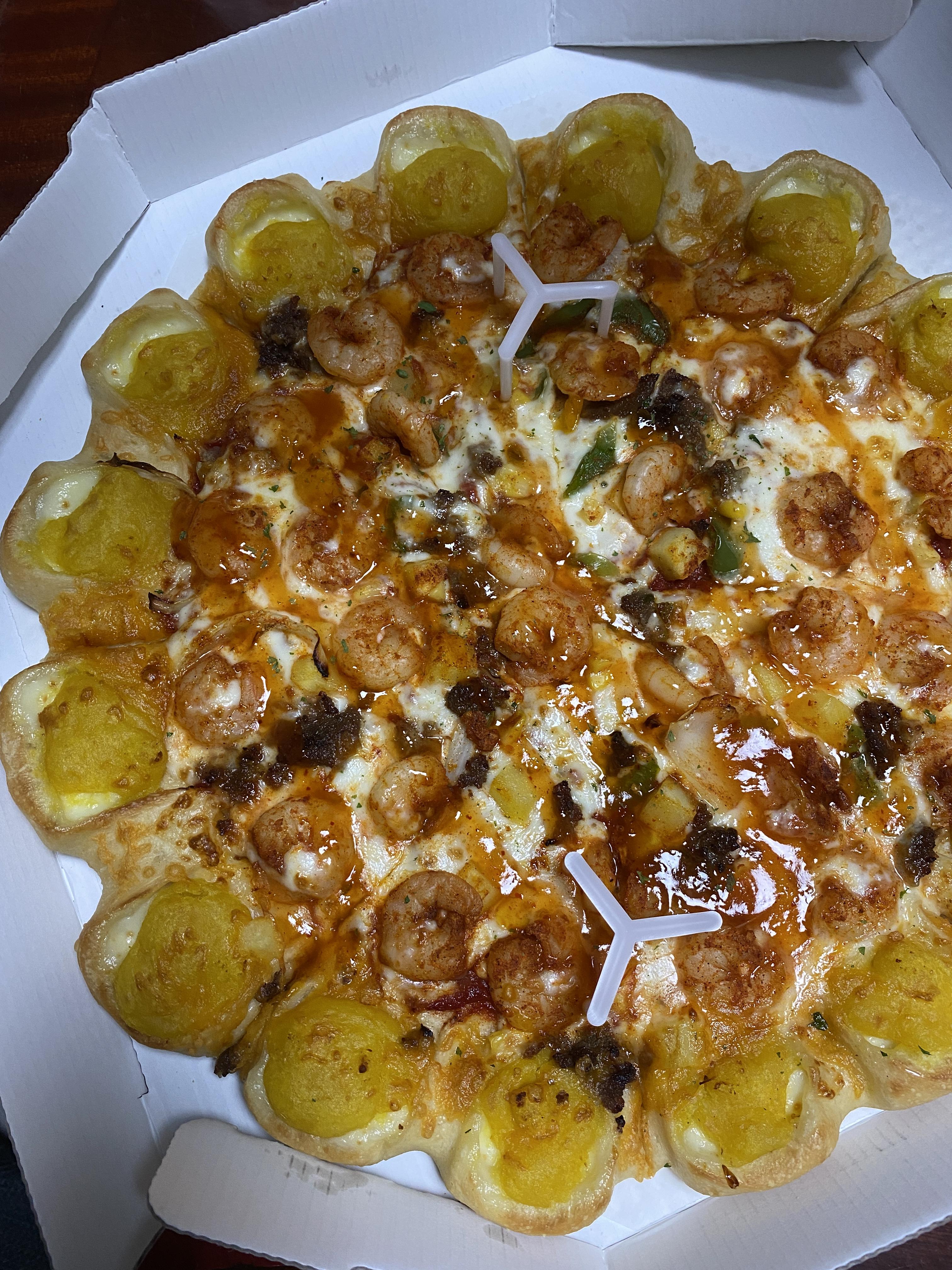 케이준 더블 쉬림프 피자에 추가로 뒤에 콘 치즈 포켓을 고를 수 있습니다