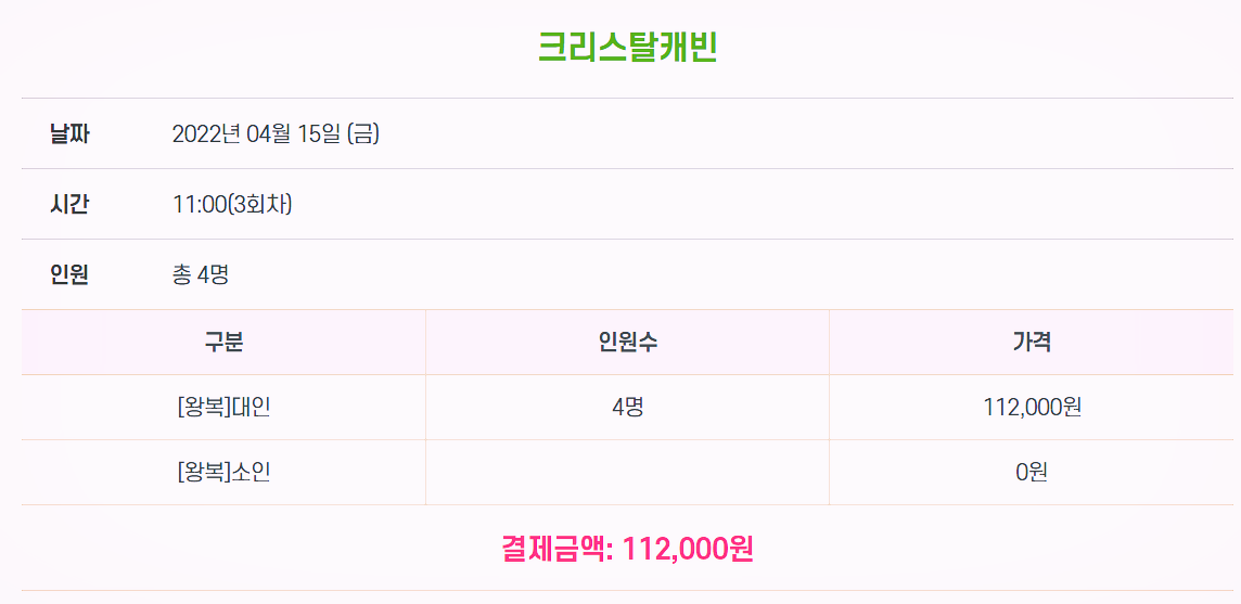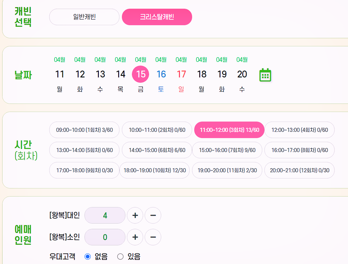 전 크리스탈 캐빈으로, 4월 15일 금요일, 오전 11시 회차를 골랐습니다