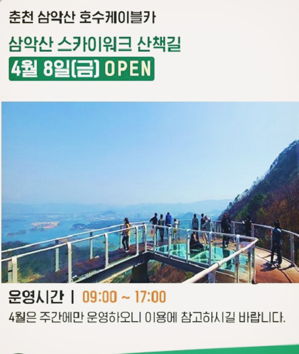 일단 가볼 곳 중에 한 곳인 삼악산 스카이워크 산책길의 경우 4월 8일 금요일부터 오픈을 하였습니다