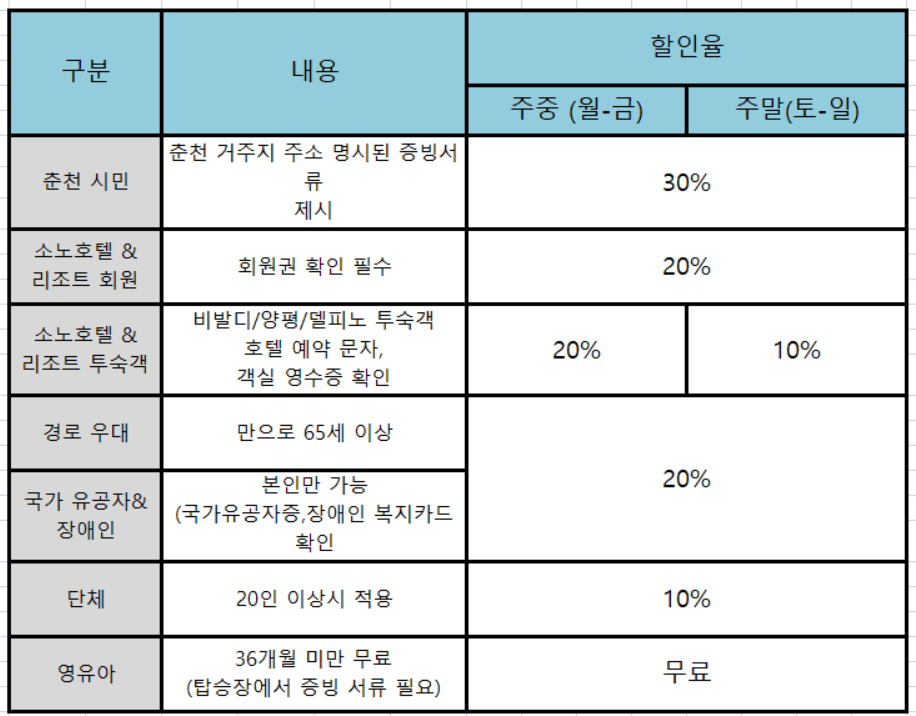 아래 내용 중에 속하신다면 케이블 카를 할인받을 수 있습니다