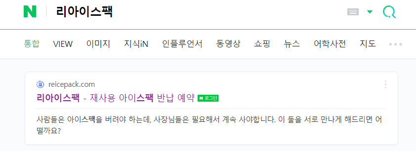 아래처럼 네이버에서 리아이스팩으로 검색하면 볼 수 있는데, 우리에겐 필요없지만 자영업하시는 분들에게는 필요한 아이스팩을 전달해드림으로써 환경을 보호하는 방법입니다.