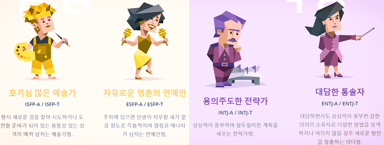 한가지 재밌는 점은 위에 유형들은 자신과 가장 비슷한 유형, 그리고 가장 정 반대의 유형들이기 때문에 이것만으로 궁합을 보긴 어렵다는 점입니다.