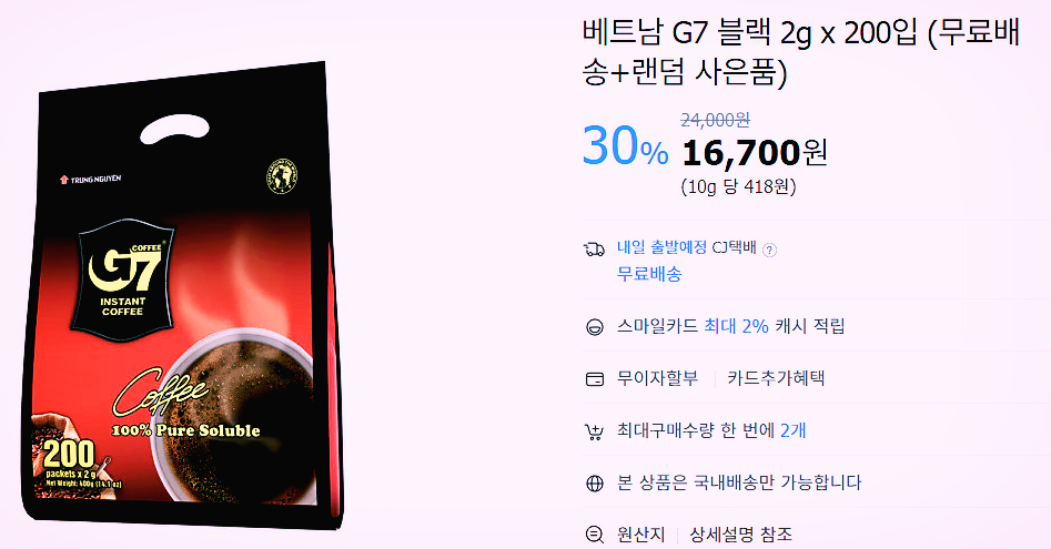 (참고로 g7 블랙커피 개당 가격은 42원 - 즉 커피 한잔에 42원입니다 - 미췬 가성비 수준)