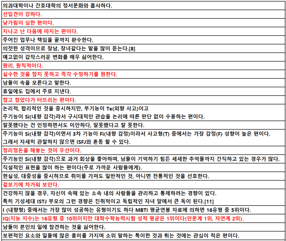 생각보다 제 친한 친구중 ISTJ인 친구를 생각하면서 봤는데 놀랍게도 비슷한 점이 정말 많았습니다.