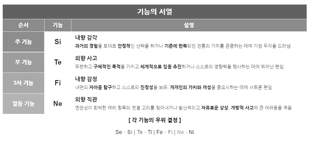 아래는 ISTJ가 가지고 있는 특성 중 가장 높은 성향대로 순서를 내린 서열입니다.