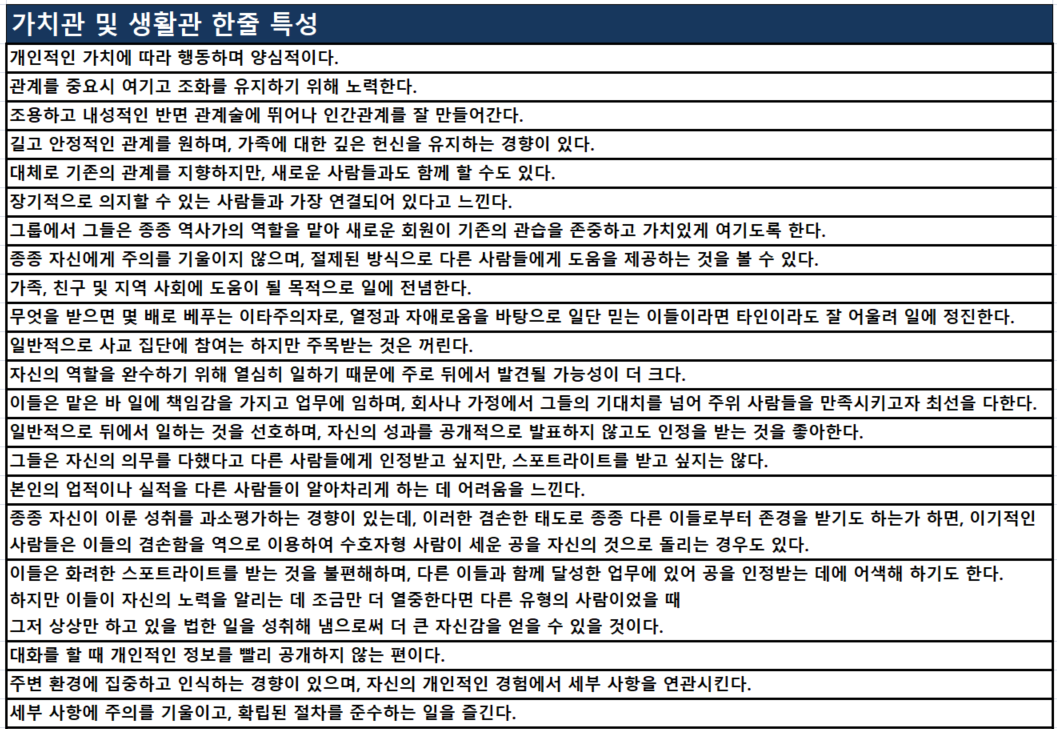 2. 가치관과 생활함에 있어서 보여지는 이프제 특성 두가지로 나눠져있습니다.