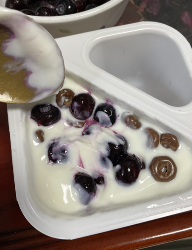 그렇기 때문에 초코 과자가 소량 포함된 요거트 제품과 블루베리를 함께 먹는 편입니다.
