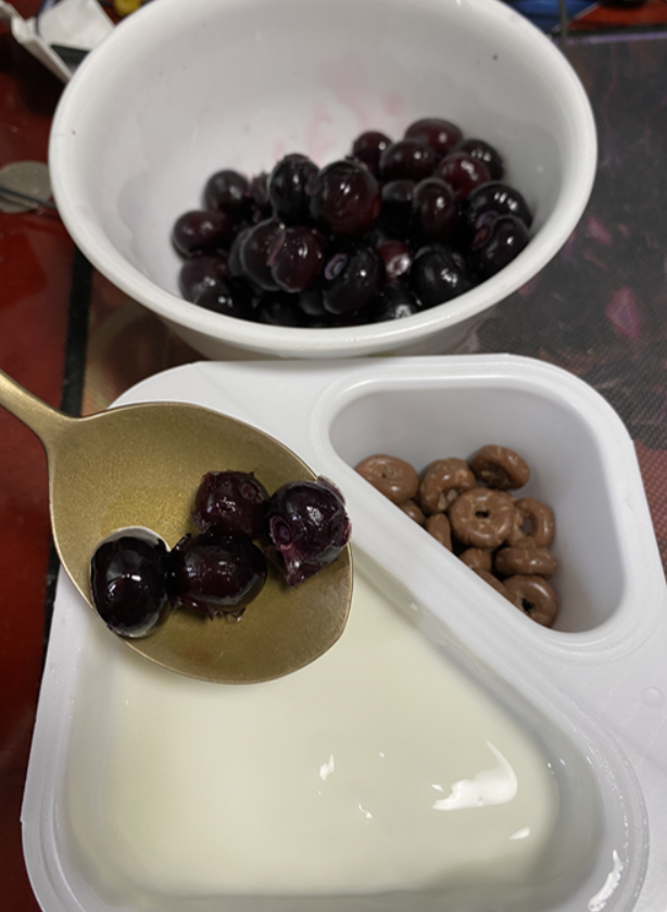 그렇기 때문에 초코 과자가 소량 포함된 요거트 제품과 블루베리를 함께 먹는 편입니다.